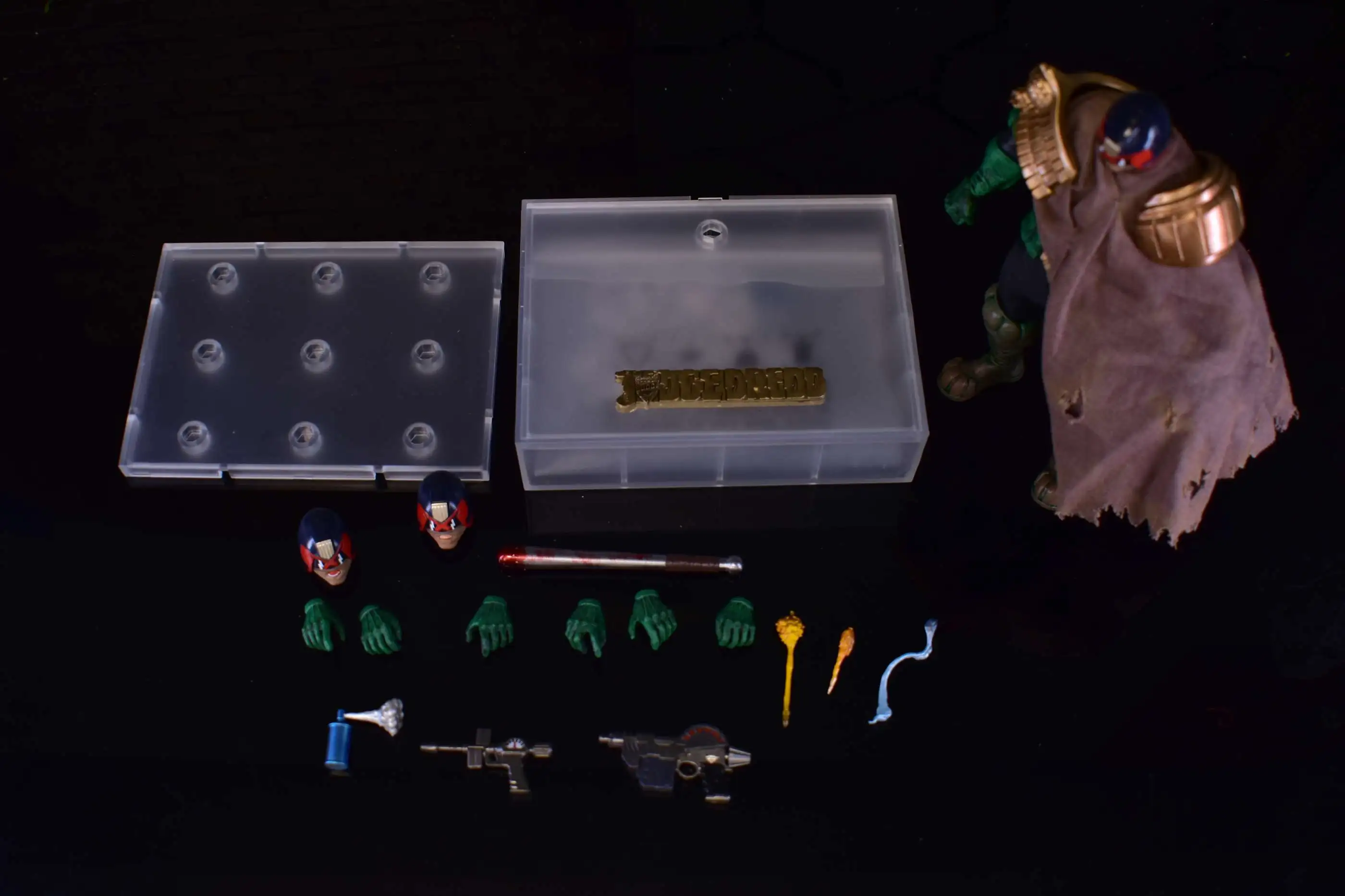 - Includes multiple accessories: classic Lawgiver sidearms, gun flame effects, nightstick, replacement hands/faces, and display base.