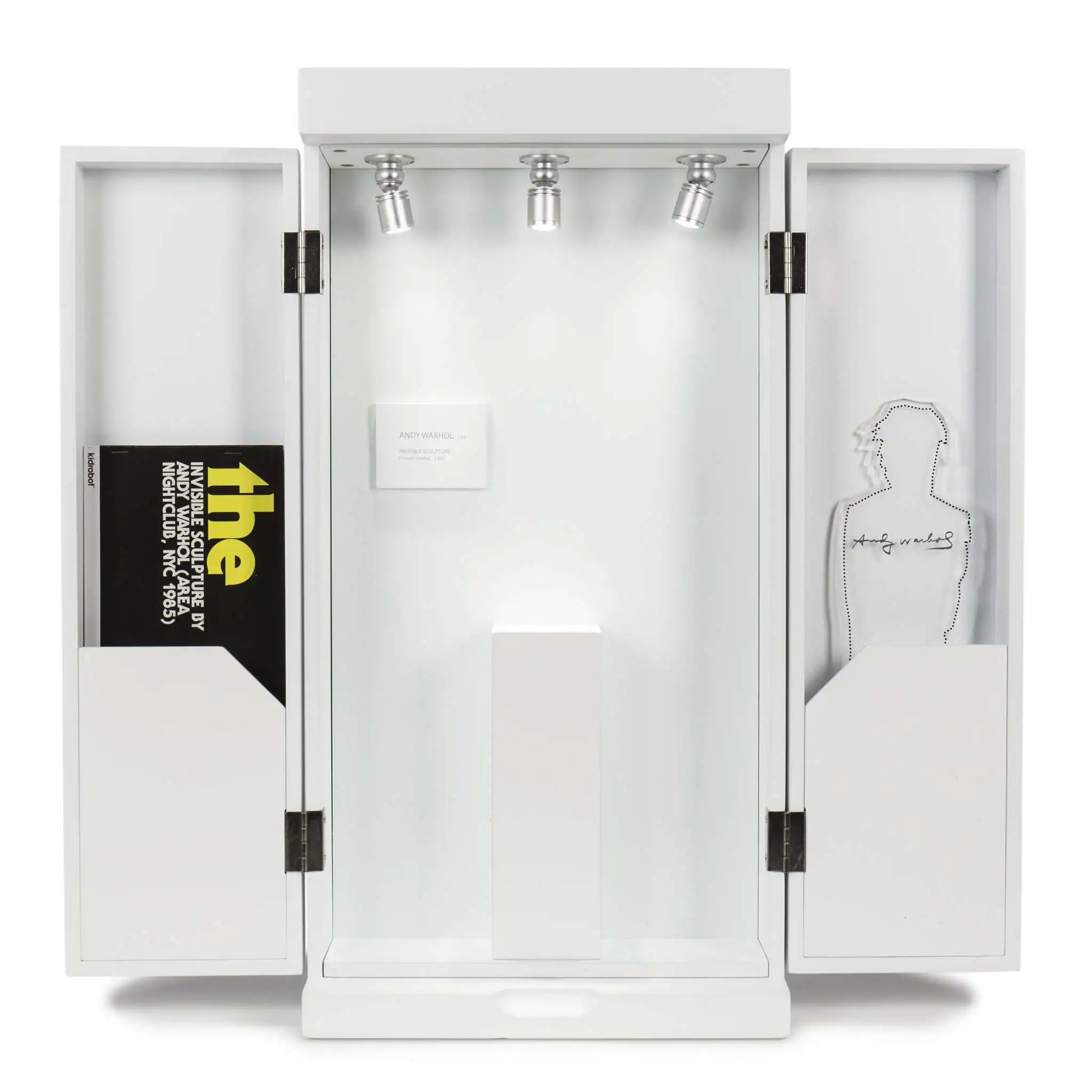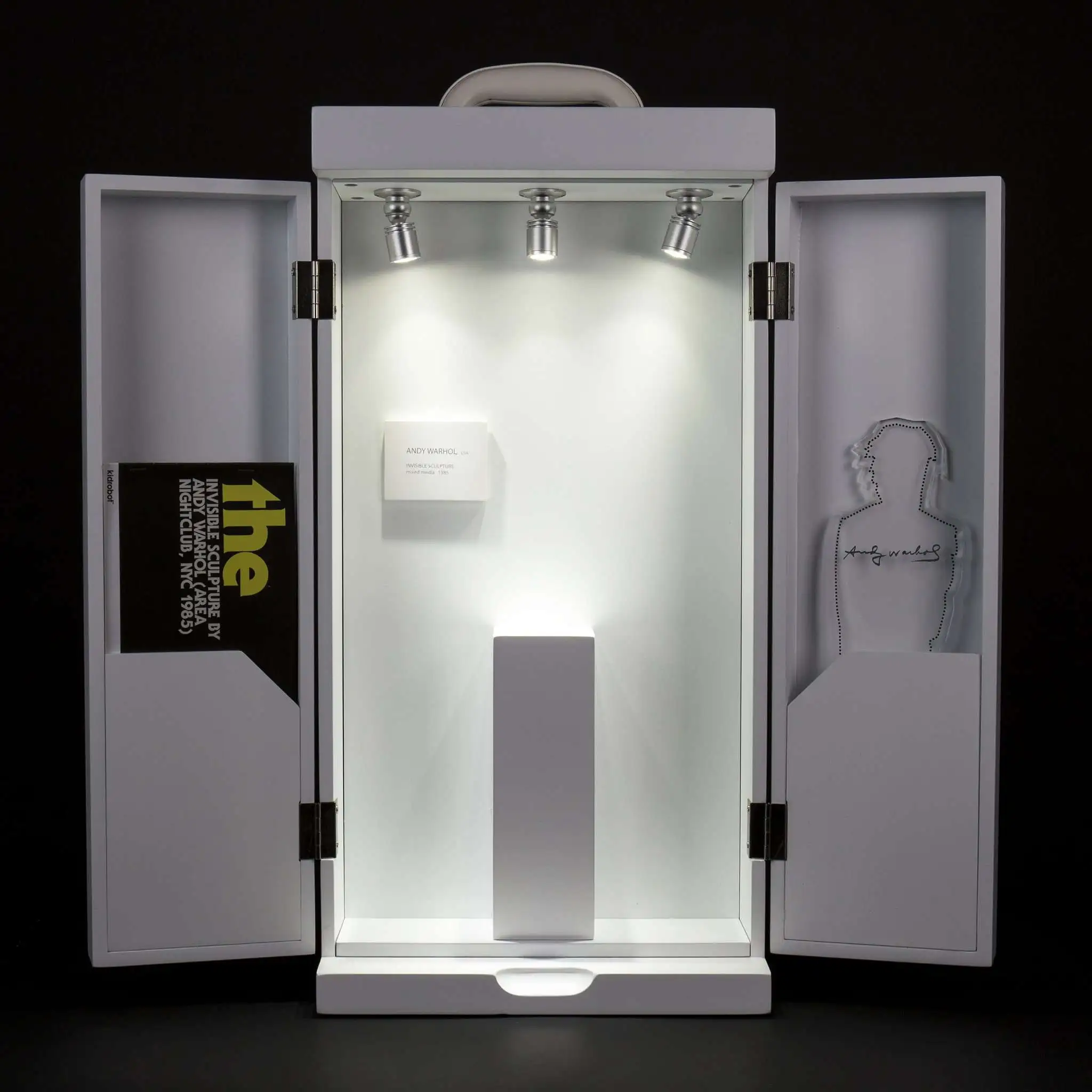 In 1985 Andy Warhol created The Invisible Sculpture via performance art at the famed, New York downtown nightclub Area. The concept of his Invisible Sculpture was to show that the absence of something could be art. To activate the work Warhol briefly stood on a pedestal in the nightclub. Warhol then stepped off the plinth and walked away leaving only the pedestal and a small wall label reading Andy Warhol, USA, Invisible Sculpture, Mixed Media, 1985. Now, Kidrobot is recreating The Invisible Sculpture as a diorama with a clean presentation. The inspired box closes securely and includes a handle, and the minimal styling matches the powerful aesthetic of the original Invisible Sculpture. Perfect for every Andy Warhol enthusiast.