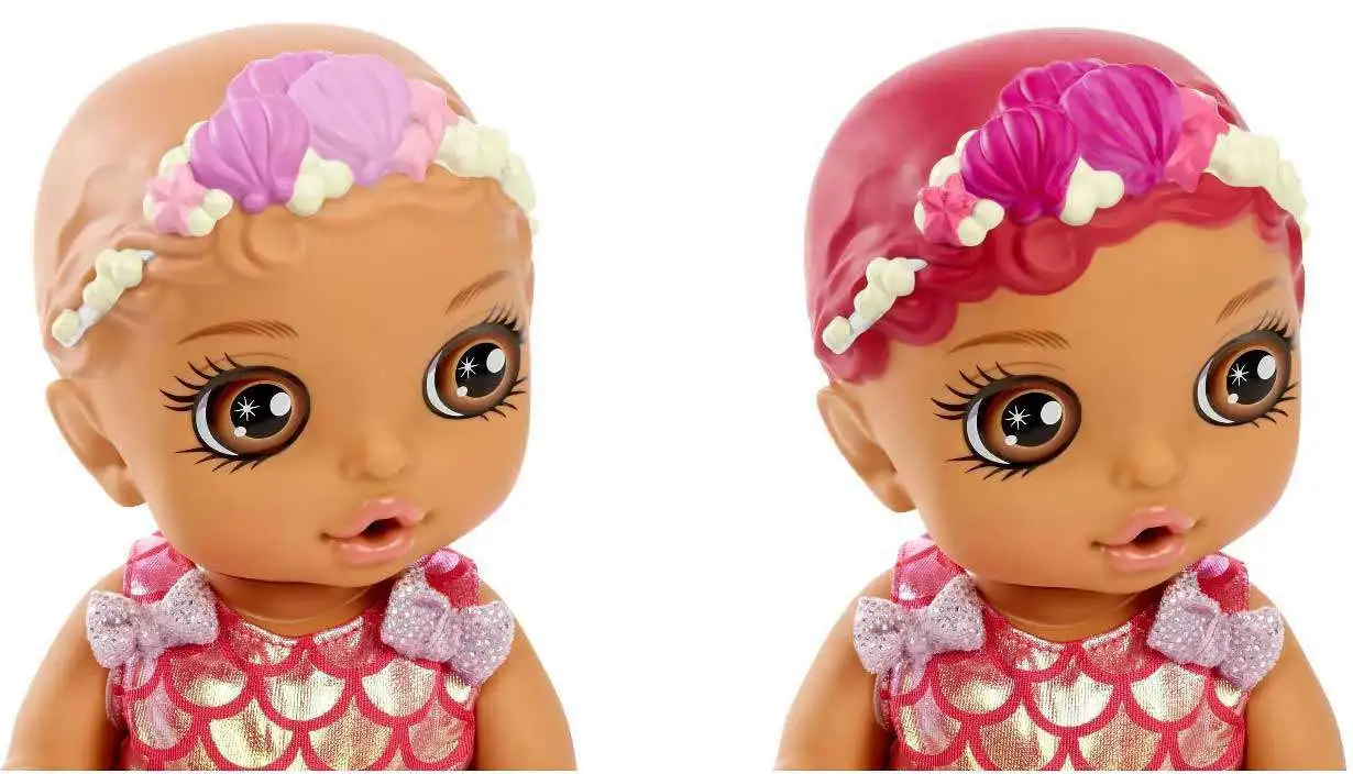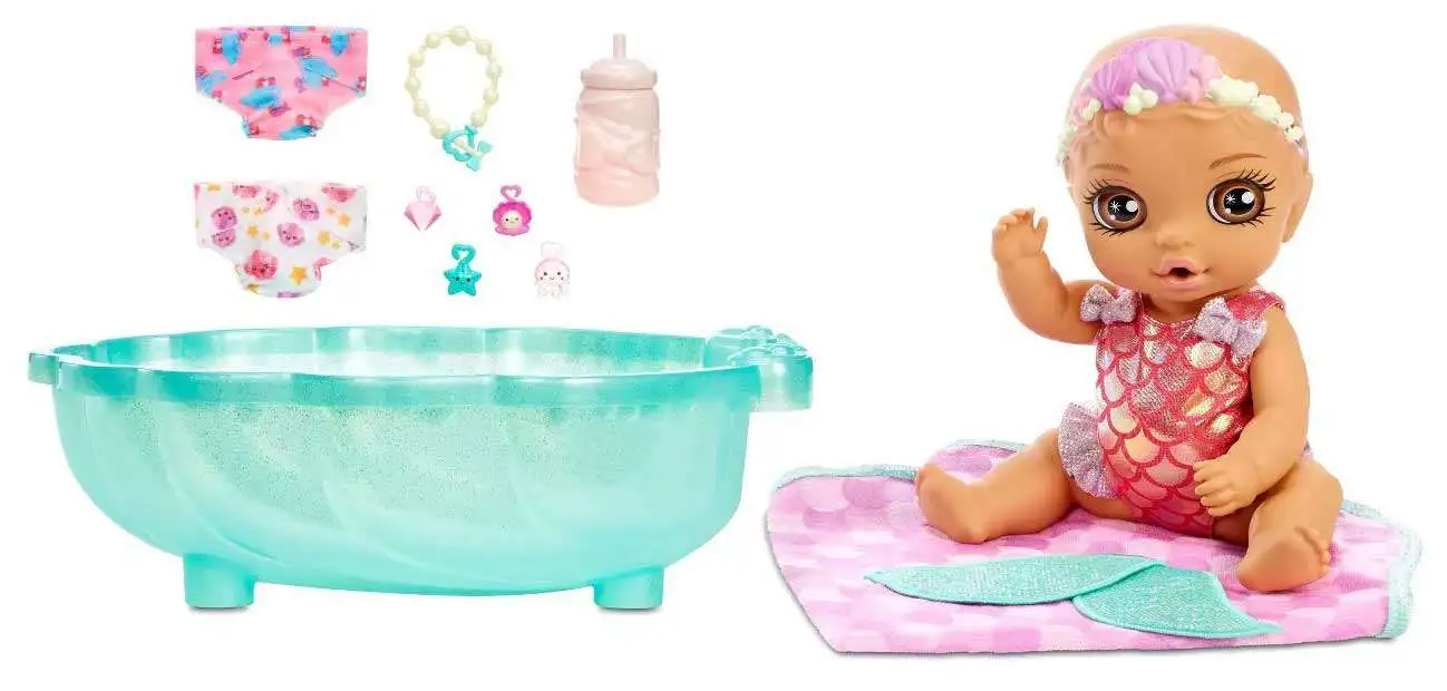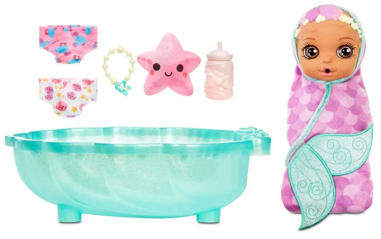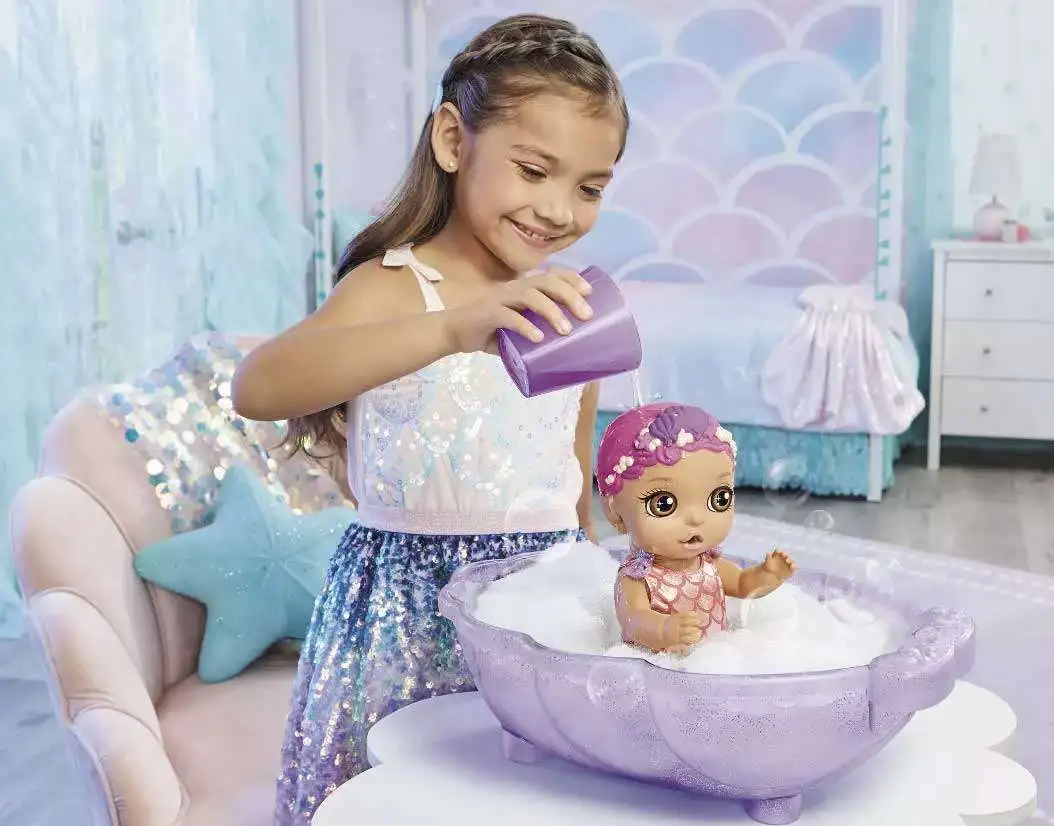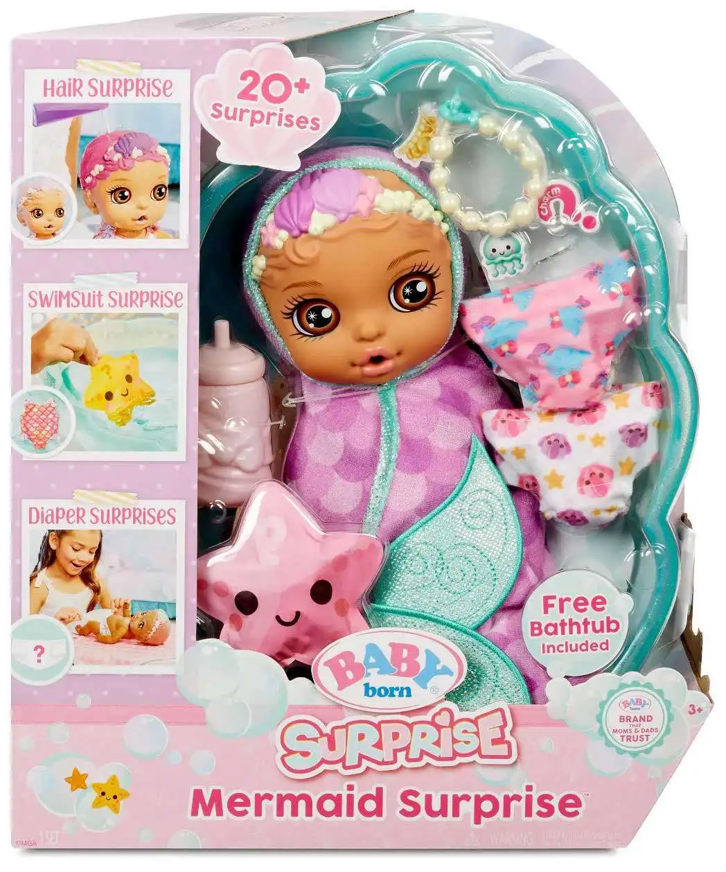 Get ready for a splish and a splash of water surprises with BABY born Surprise Mermaid Surprise. This sweet baby doll comes in her own real, sparkly, seashell bathtub. Use water to wipe away her sleepy eyes to reveal her eye color. Then unwrap her mermaid towel swaddle to discover her adorable hairstyle. Give baby a bath in her bathtub and rinse her with cold water to reveal her color change hair surprise. After her bath, feed her from her bottle, and she really pees. The water reveals a diaper surprise charm and color change. Dip her cute starfish in water and watch it dissolve to reveal her adorable, shimmering swimsuit. Use the details about her to find her name and fill in her unique story. Each Mermaid Surprise includes a doll with wipe-away eyes and color change hair, 2 diapers with diaper surprises, 2 charm, a charm bracelet, a mermaid towel, a bottle, a collector's guide with games and a sparkly, seashell bathtub.