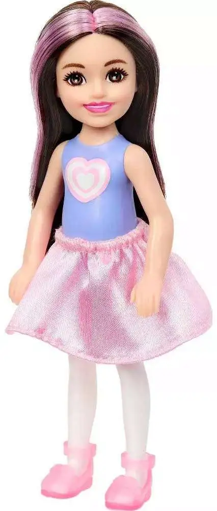 - Lift the costume head and reveal a Chelsea small doll with long, pink-streaked brunette hair and twinkle-shine shape face details.