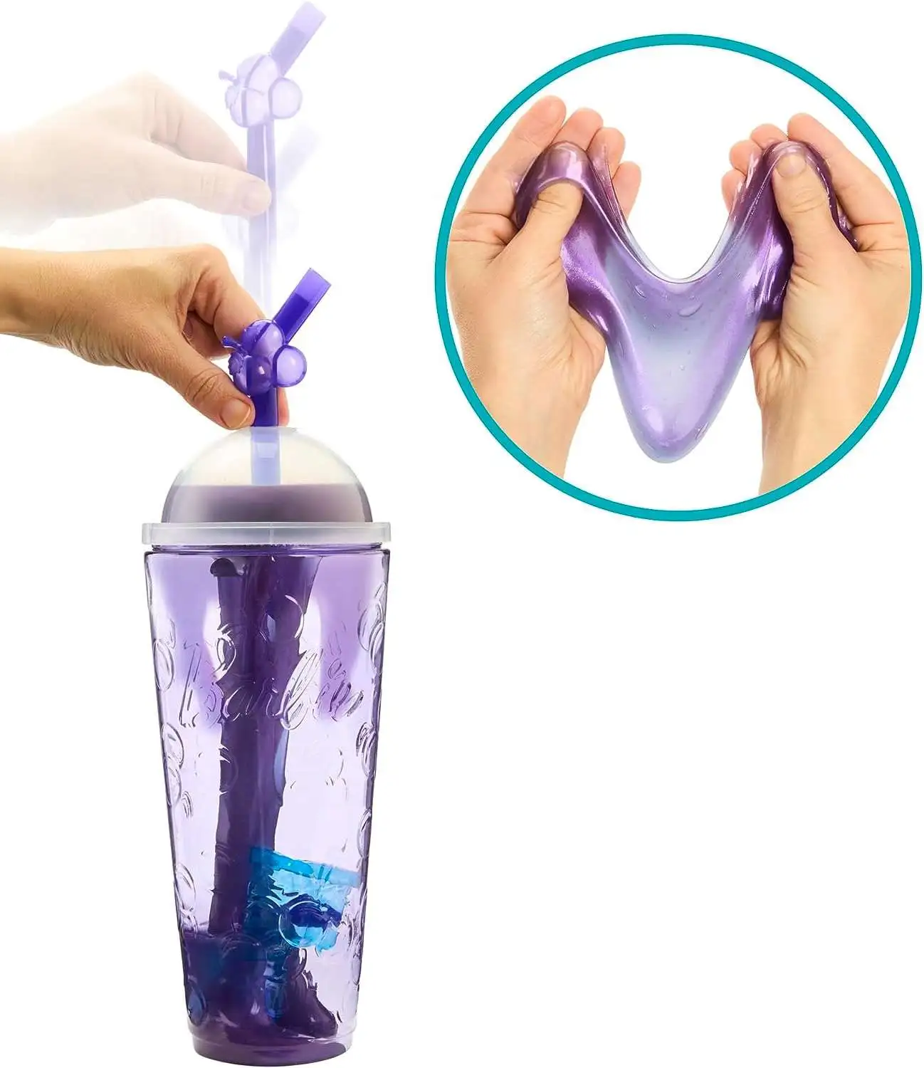 Kids remove the outer layer of packaging, open the cup and pull out the surprise bags, then screw the lid back on and pop the top with the straw-like piece to release squishy, purple Slime over the ice cubes!