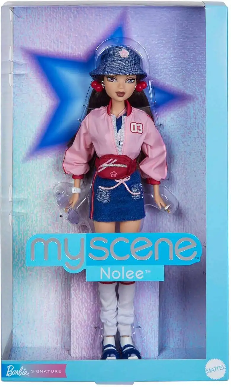 - My Scene Nolee doll mixes sporty nonchalance with glam edginess in a Y2K-inspired outfit! She wears a blue terrycloth matching set paired with a candy pink, cropped jacket.