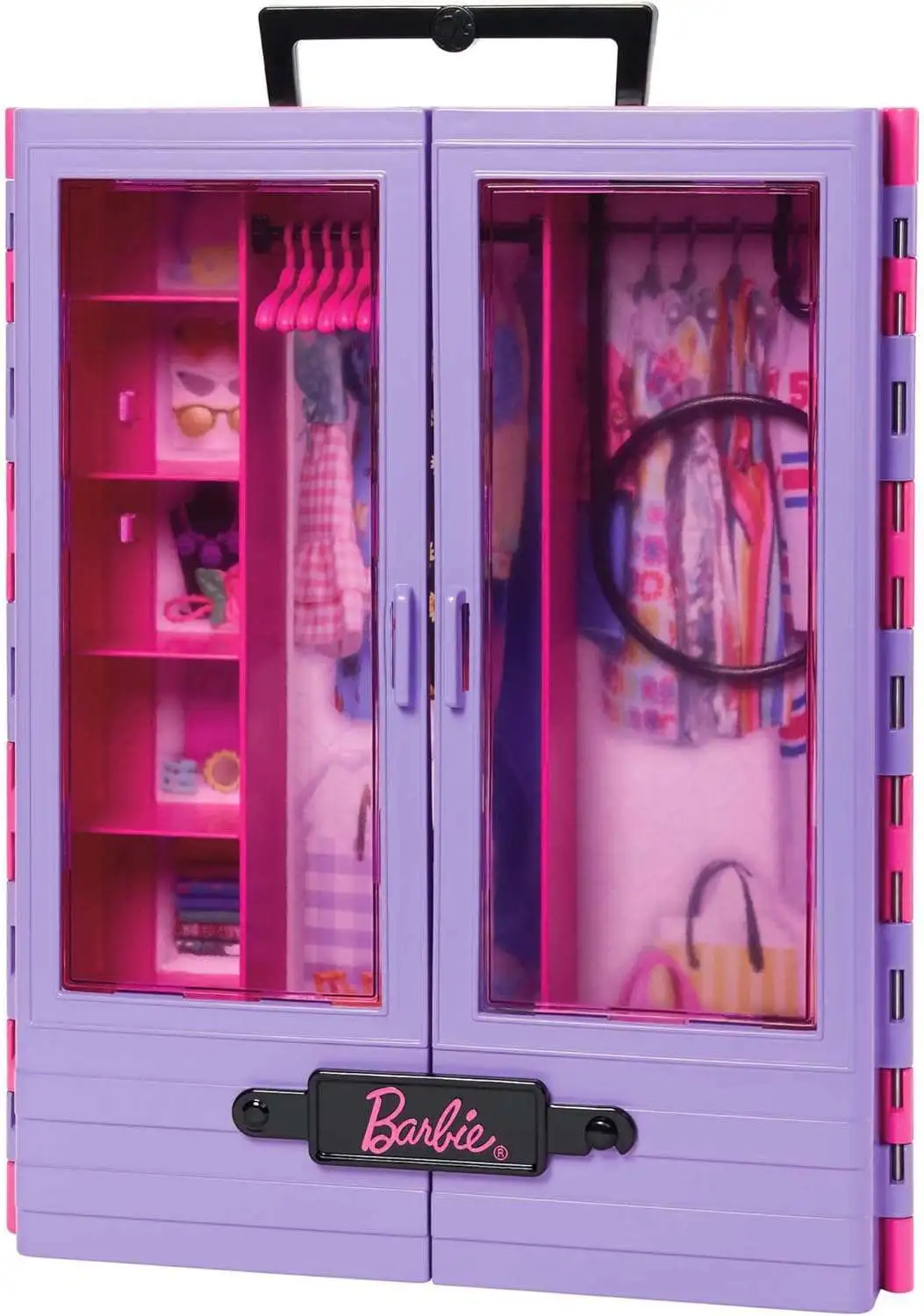- The closet has a purple exterior with a pink interior and is decorated with clear double doors for a glimpse into Barbie doll's wardrobe.