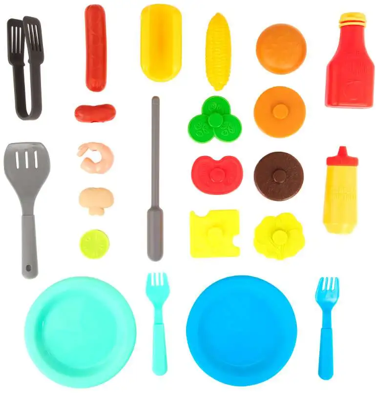 - Includes: A toy BBQ with a grill, a storage basket, removable tabletop, ketchup bottle, mustard bottle, skewer, 2 plates, 2 forks, spatula, pair of tongs, and 14 pieces of toy food.