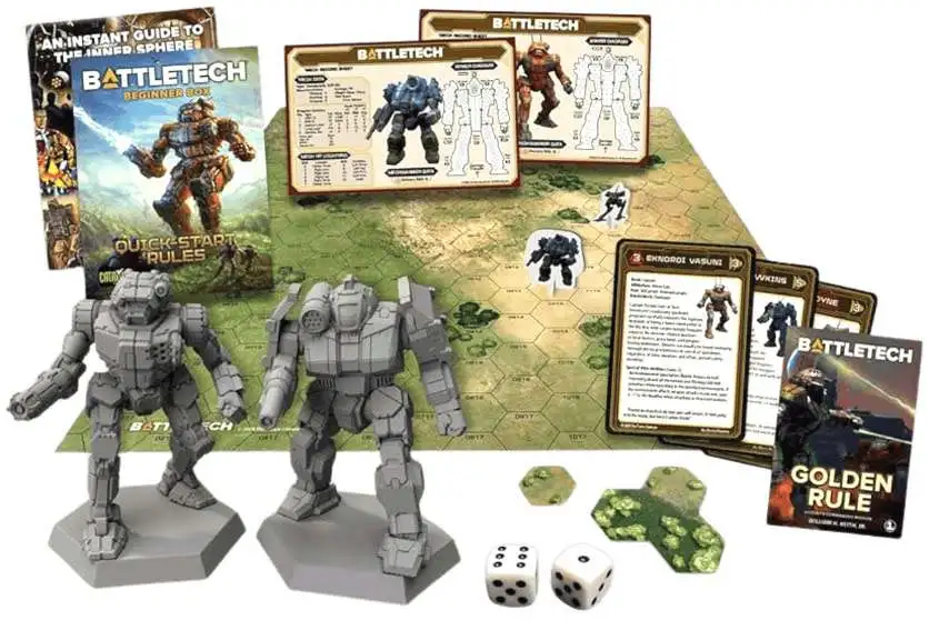 BattleTech is the world's greatest armored combat game, filled with epic stories and gaming experiences to satiate any player: miniatures to RPG play, hobby painting to fiction, and beyond. The BattleTech Beginner Box is the first step on that fantastic journey and includes everything you need to get started: two high-quality miniatures, quick-start rules, a mapsheet, cards to represent your MechWarrior's unique skills, dice, and more.