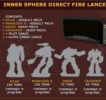 each Inner Sphere Lance includes four 'mechs (no assembly required) along with four MechWarrior pilot cards and four Alpha Strike cards.