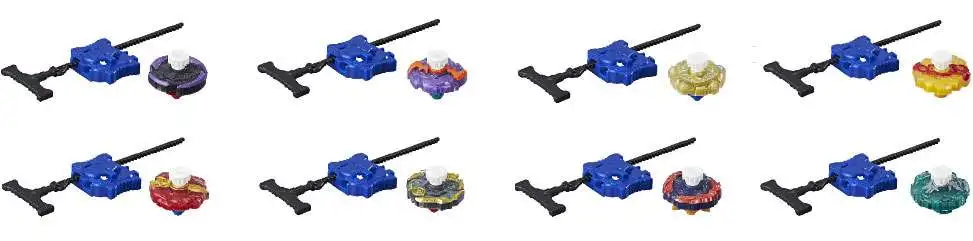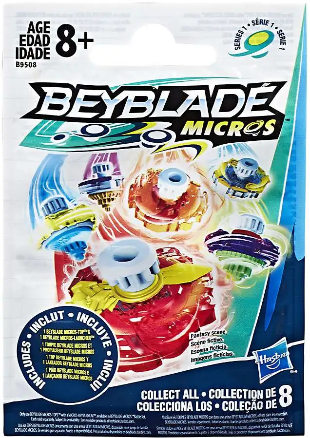 Beyblade Micros contain 1 Beyblade Micros-Top [consisting of 1 Beyblade Micros-Energy Layer and 1 Beyblade Micros-Performance Tip], and 1 Beyblade Micros-Launcher.