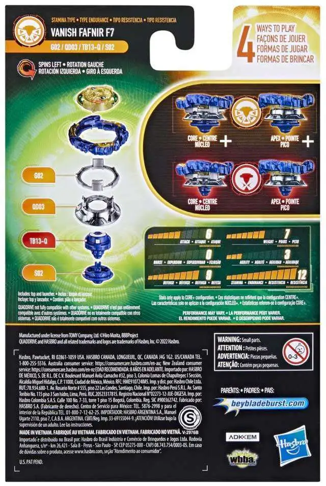 CUSTOMIZE THE CLASH: Includes left-spin Beyblade Burst QuadDrive Vanish Fafnir F7 G02 QD03 TB13-Q S02 top and launcher. Customize top to Core and Apex mode for balance type or to Core+ and Apex+ mode for stamina type