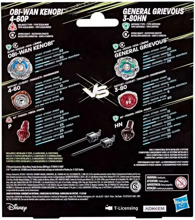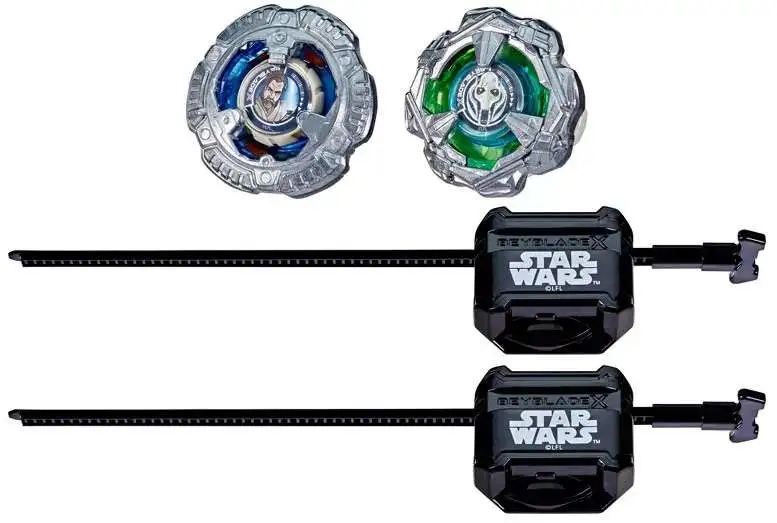 - HARNESS THE POWER: Includes 2 Takara Tomy-designed Beyblade X tops with authentic die-cast metal parts: Obi-Wan Kenobi 4-60P Right-Spin Balance Type and General Grievous 3-80HN Right-Spin Defense Type; and 2 launchers