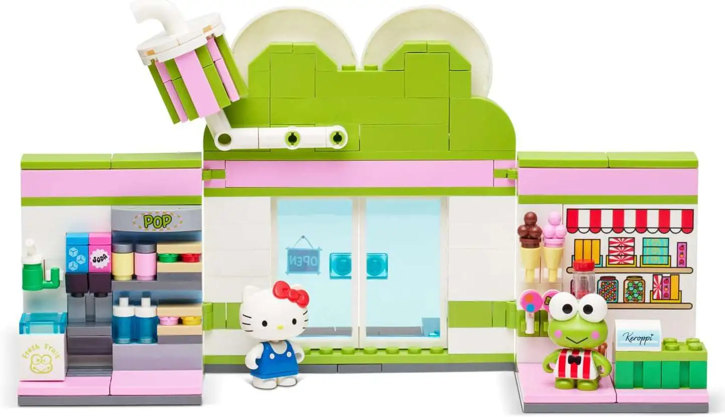 - MINIFIGURES & ACCESSORIES Keroppi and Hello Kitty poseable minifigures can grab a cup of soda, hold an ice cream cone in one hand and a lollipop in the other, open the cooler to enjoy fresh fruit, and use the basket to carry all the sweet treats