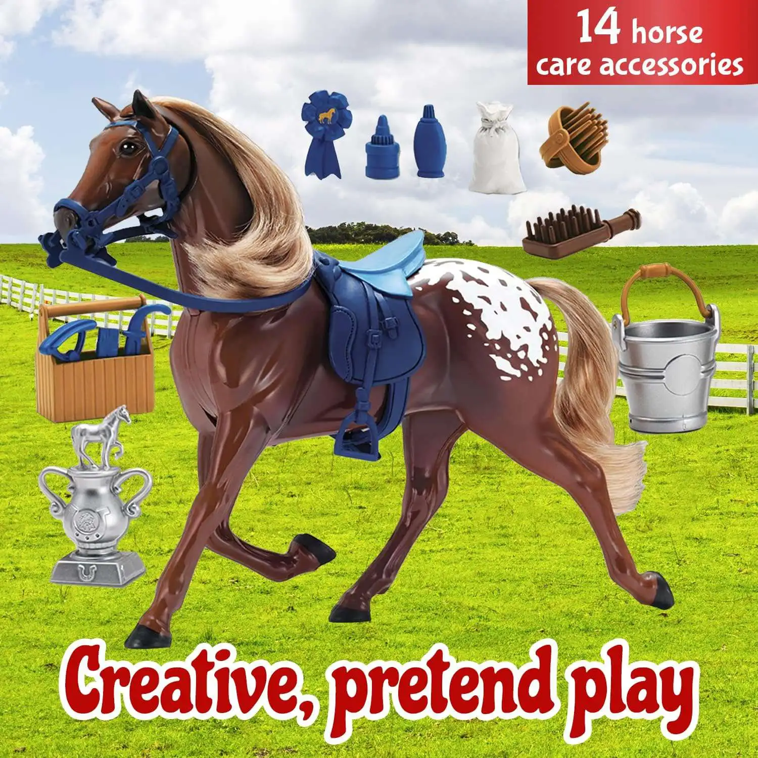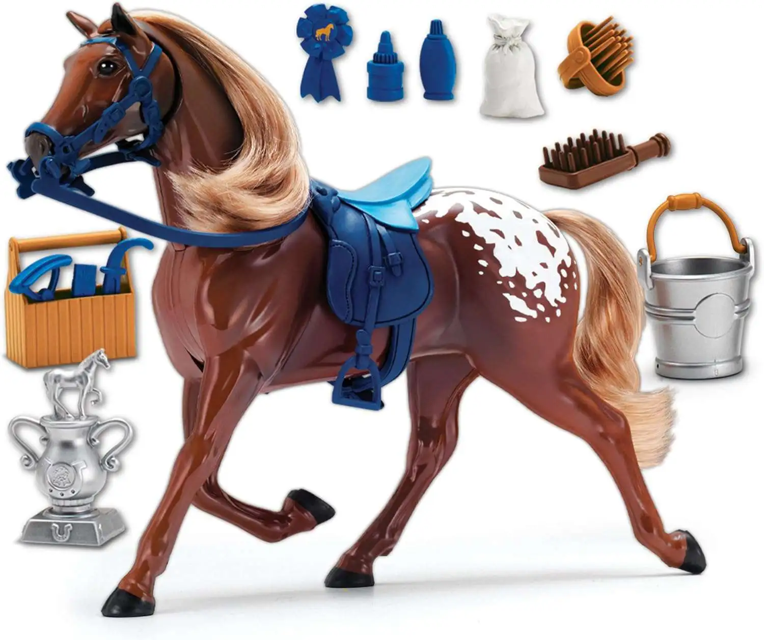 - 14 PIECE PLAYSET: Comes complete with everything you need to win the blue ribbon for best in show with 14 horse-care accessories, including a cup, a wooden case, a handle brush, and more. There is even a detachable saddle for more life like play.