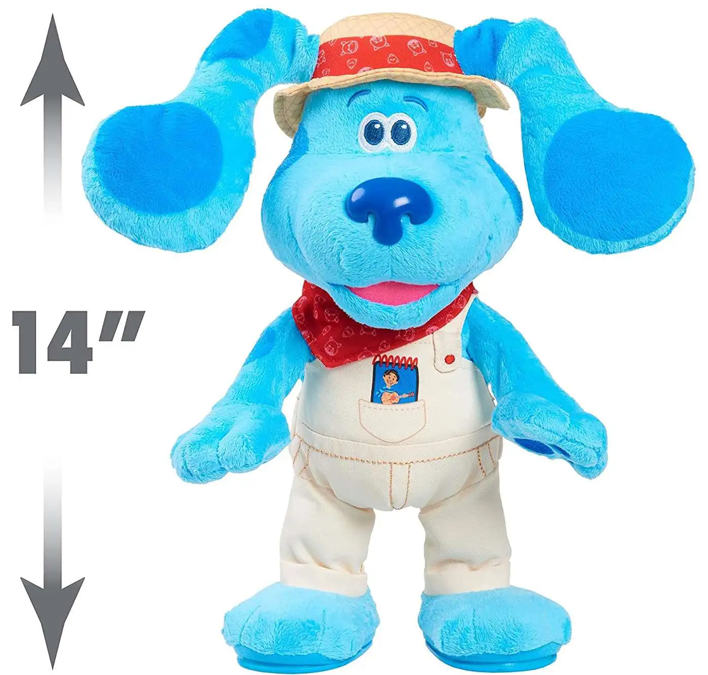 - Mixed-Materials Plush: This stuffed Blue plushie wears her Farmer Blue hat and red bandana, as seen in Blues Clues & You!, plus a cute pair of overalls. Made of super-soft fabric with embroidered details, 14-inch Bingo Blue will inspire active playtime.