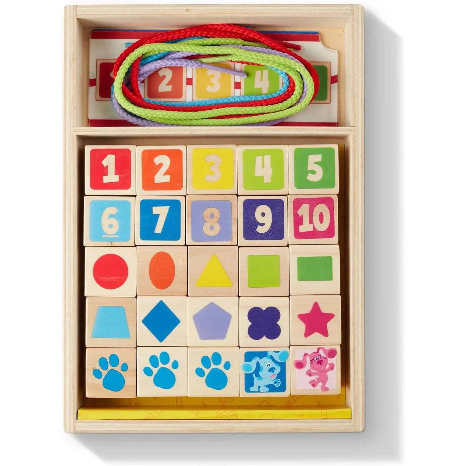 - Includes 25 1-inch wooden beads with shapes, numbers, colors, Blue's Clues & You! characters, and more, 4 lacing cords, 4 double-sided activity cards, wooden storage crate for easy cleanup
