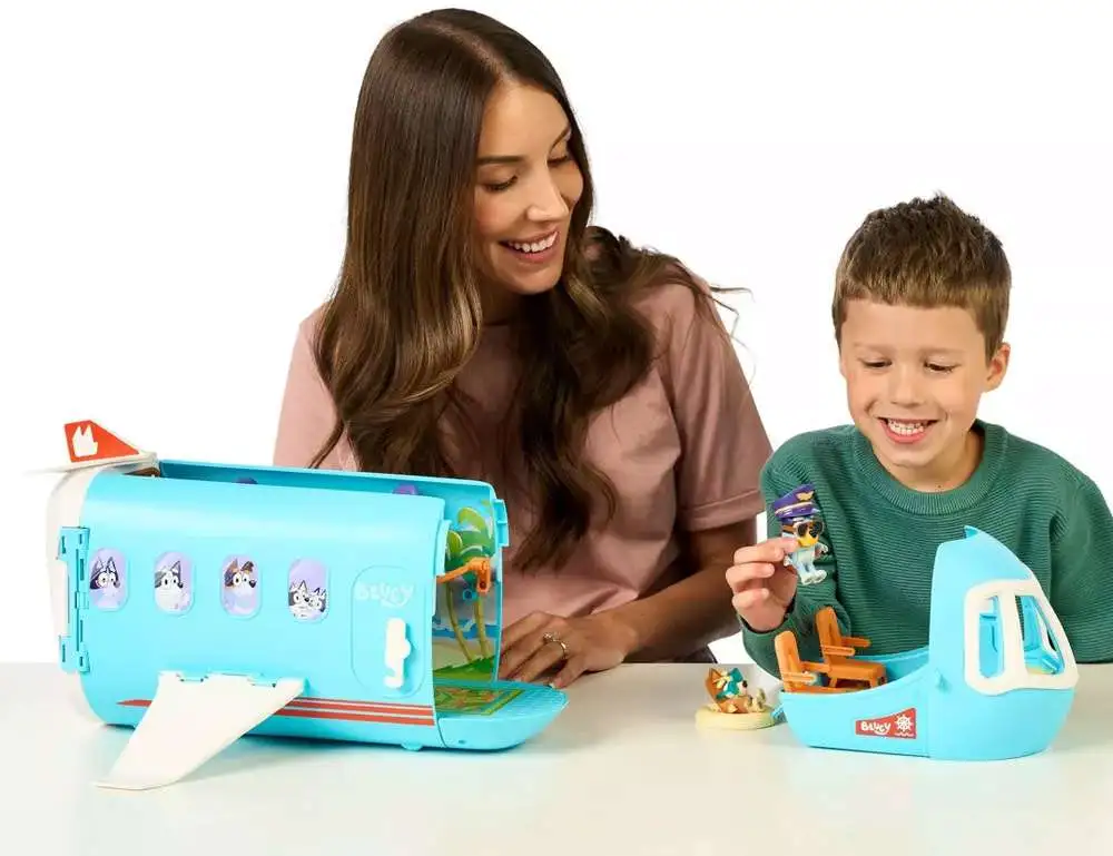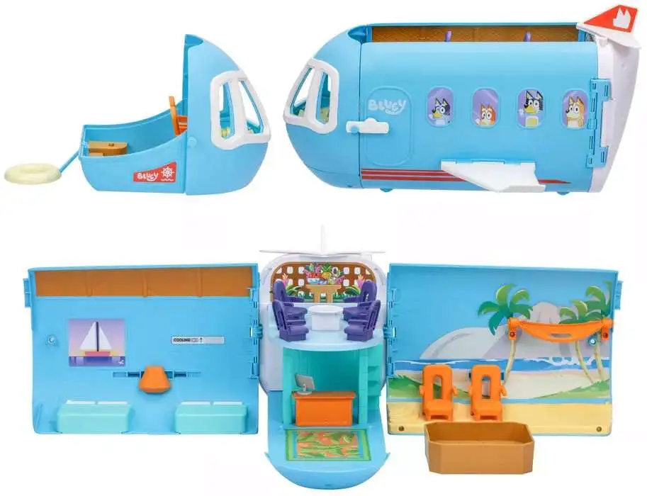 - The Bluey 3-in-1 Transforming Plane Playset! Transforms easily transforms from a plane into a resort and a boat.