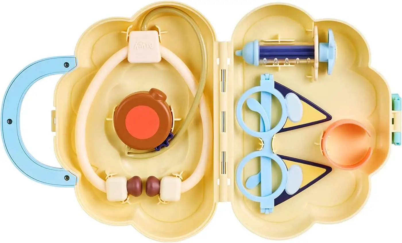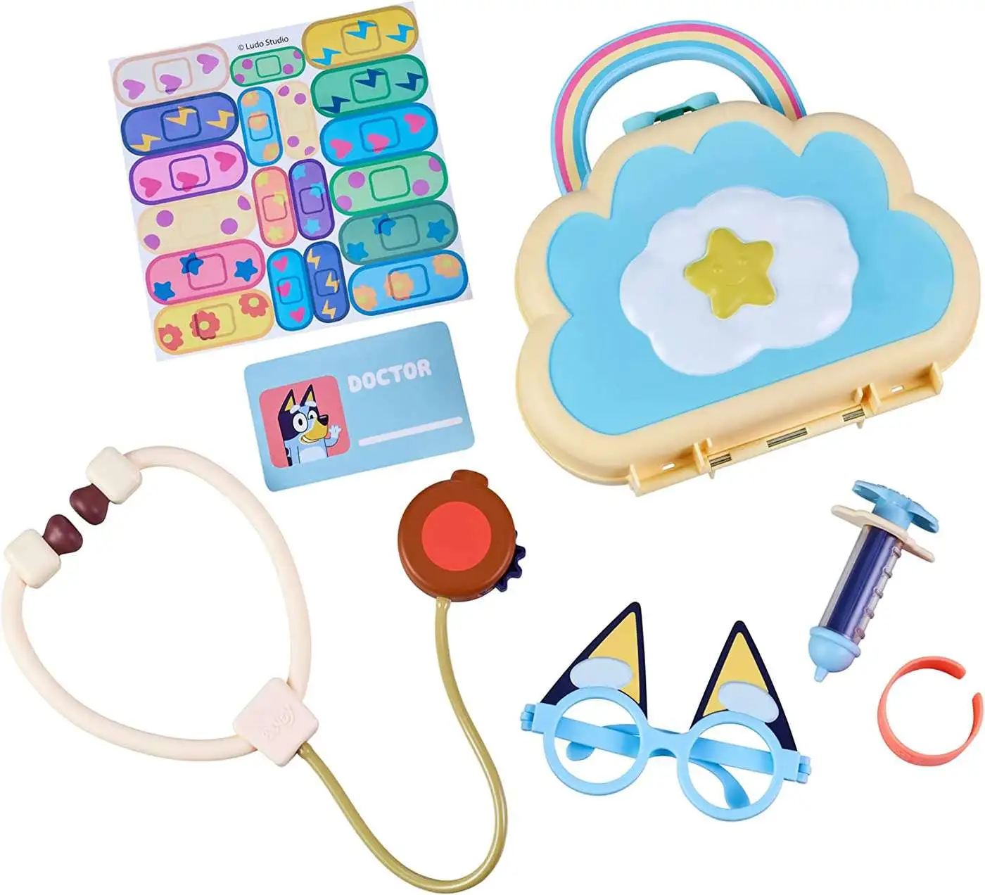 - Plenty of fun accessories including a toy Stethoscope, toy "Press & Play" Syringe, toy Bandage, Stickers, a Doctor's Badge and even a pair of Dr. Bluey Glasses!