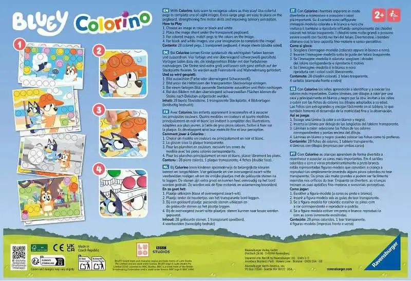 Colorino is a fun activity for children aged 2 and over: Choose a picture template, slide it under the pegboard and peg it out with the colorful blocks! The large pegboards are ideal for children's hands. The templates show colorful pictures from the world of the dog girl Bluey from the series of the same name. There are also motifs that are predominantly black and white. Children can design these as they wish and give free rein to their creativity. The game principle delights boys and girls alike and is fun right up to pre-school age. Colorino is the ideal gift for occasions such as Easter, Christmas or a 2nd birthday.