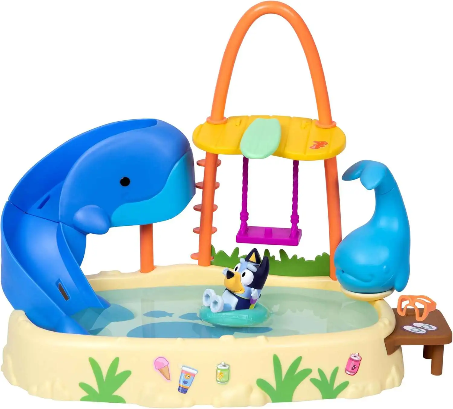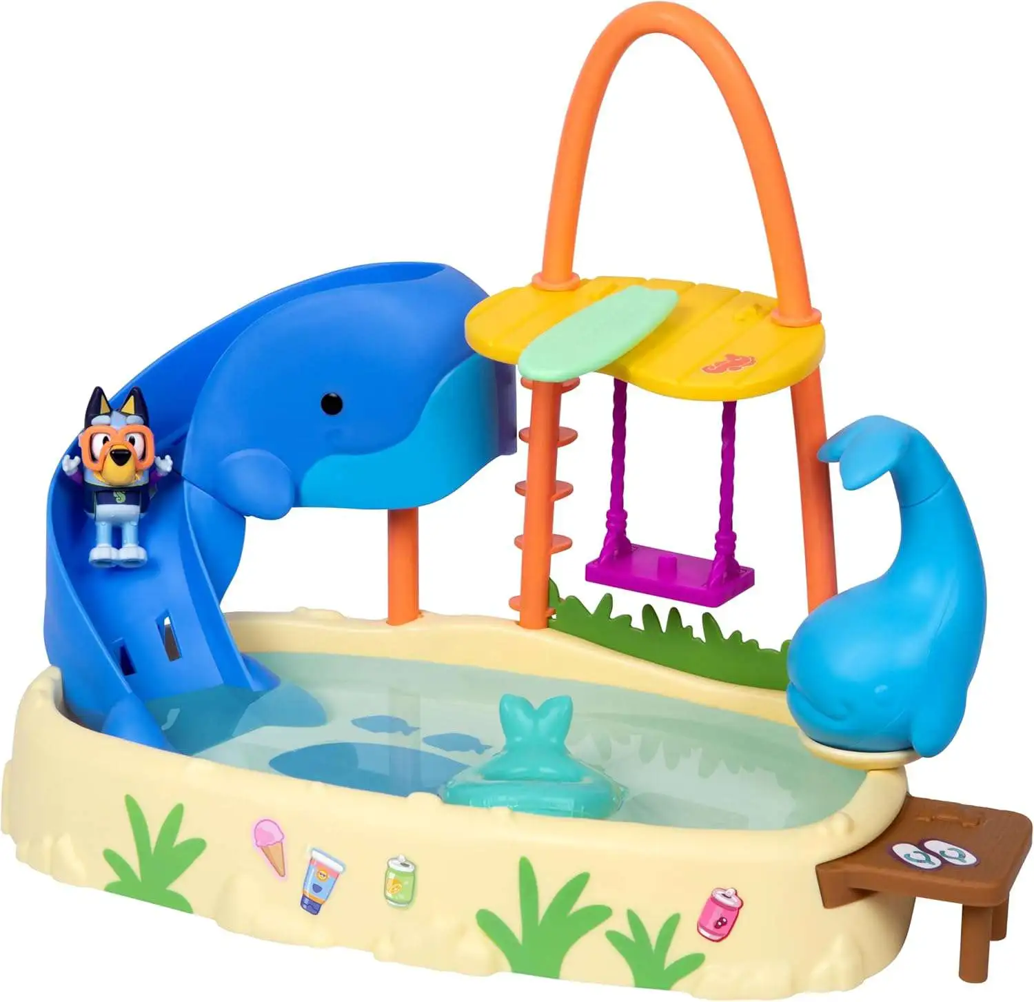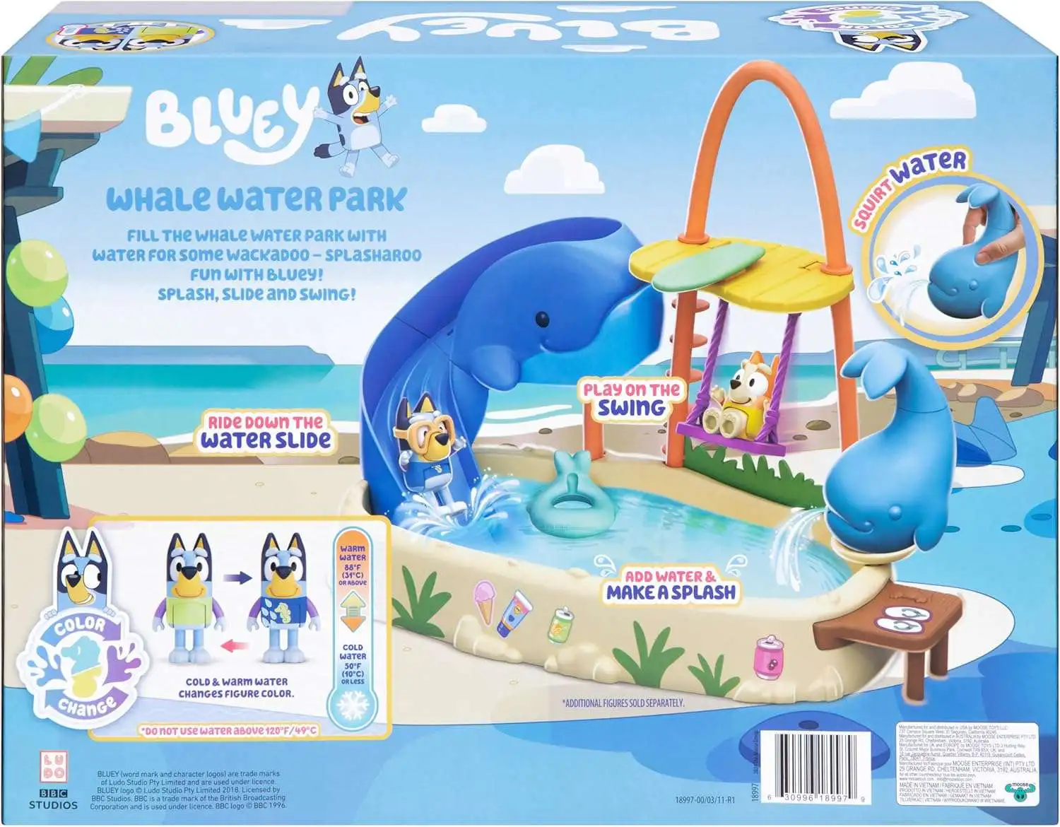 - Interactive Bluey whale-themed water park playset with water features, slide, swing, and water-action Bluey figure for energetic, imaginative fun.