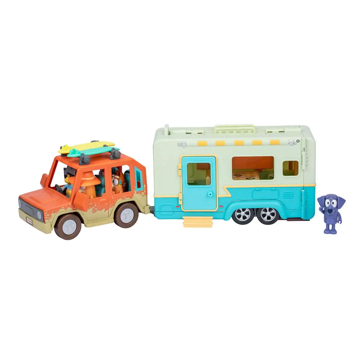 - Bluey's Beach Vacation Caravan Set includes the exclusive Heeler 4WD Family Vehicle with sandy decals. This feature enhances the beach vacation theme, adding an extra layer of fun and excitement to the playset. The Heeler 4WD Family Vehicle is designed to be hooked up to the caravan, ready to take the Heeler family on their next adventure.