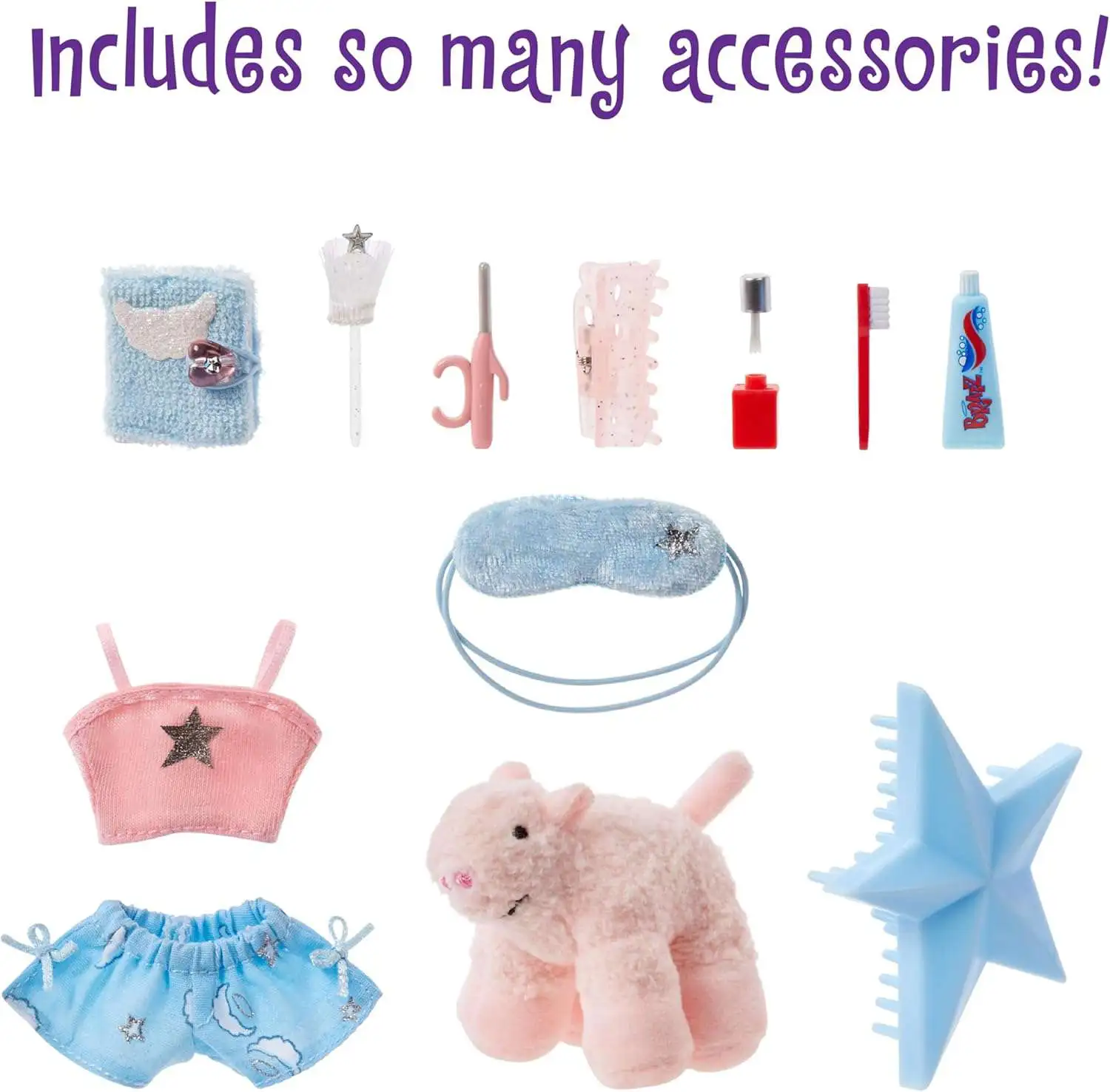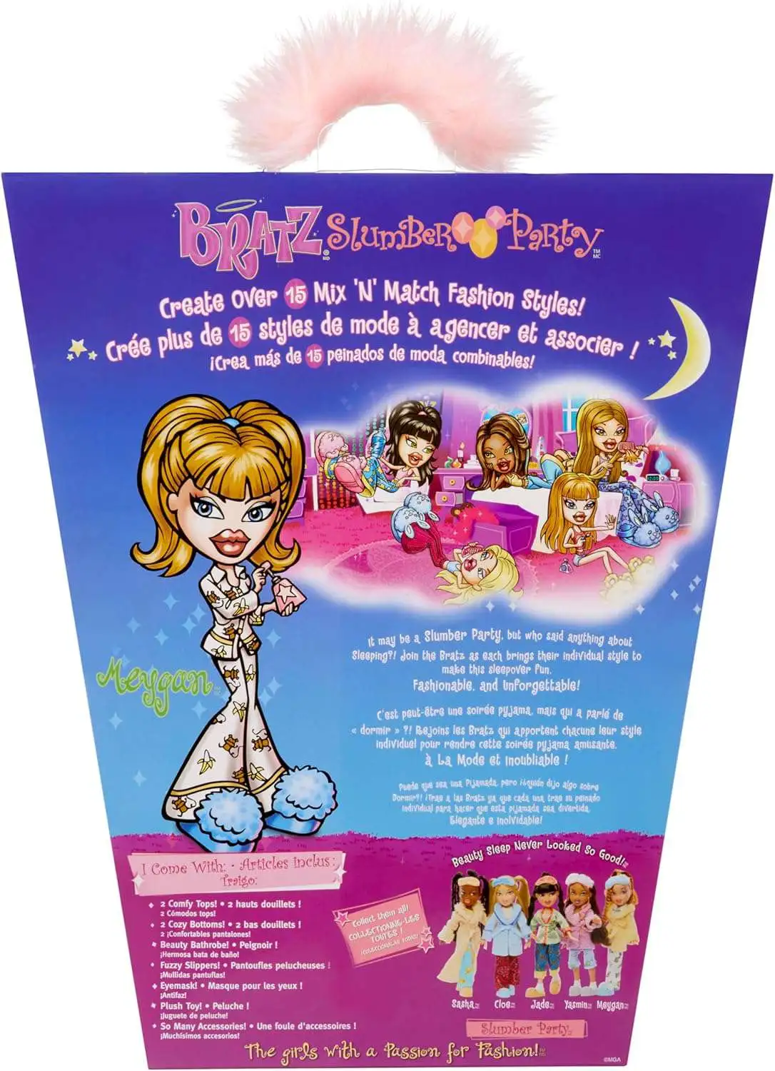- INCLUDES: 1 Bratz Slumber Party Fashion Doll, 2 tops, 2 bottoms, 1 robe, 1 eye mask, 1 plush toy, 1 pair of slippers, 1 diary, 1 pen, 1 bottle of nail polish, 1 toothbrush, 1 toothpaste bottle, 1 hair curler, 1 hair clip, 1 hairbrush, and 1 poster