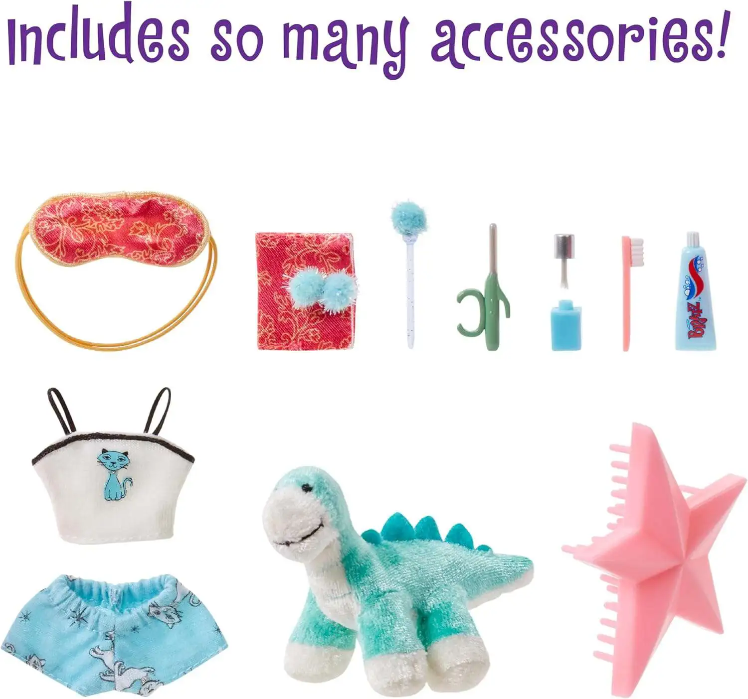 - INCLUDES: 1 Bratz Slumber Party Fashion Doll, 2 tops, 2 bottoms, 1 robe, 1 eye mask, 1 plush toy, 1 pair of slippers, 1 diary, 1 pen, 1 bottle of nail polish, 1 toothbrush, 1 toothpaste bottle, 1 hair curler, 1 hairbrush, and 1 poster