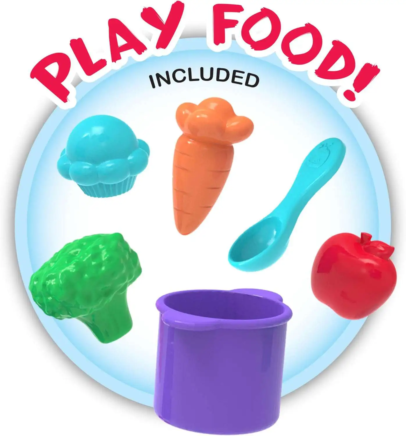 - Includes: playset, 26 letters, 5 pretend foods, pot, and spoon.