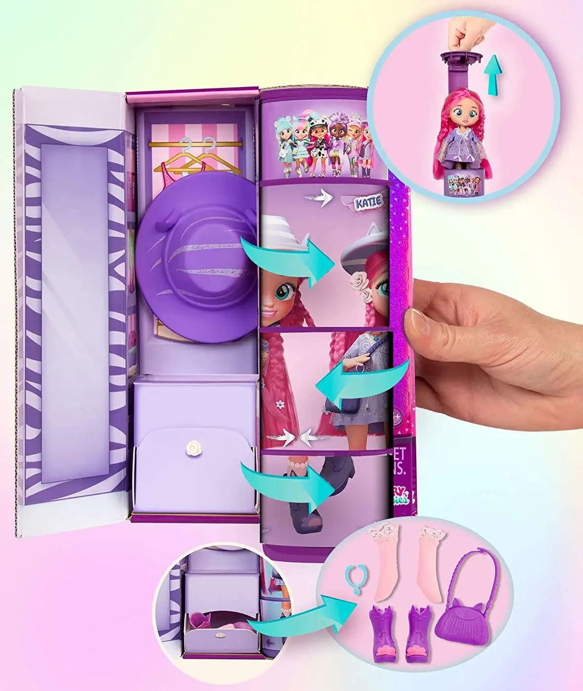 - FUN UNBOXING: Spin the cylinders to see Katie's strike different poses! Open to reveal her closet and accessories! Discover your doll in the cylinder portion!