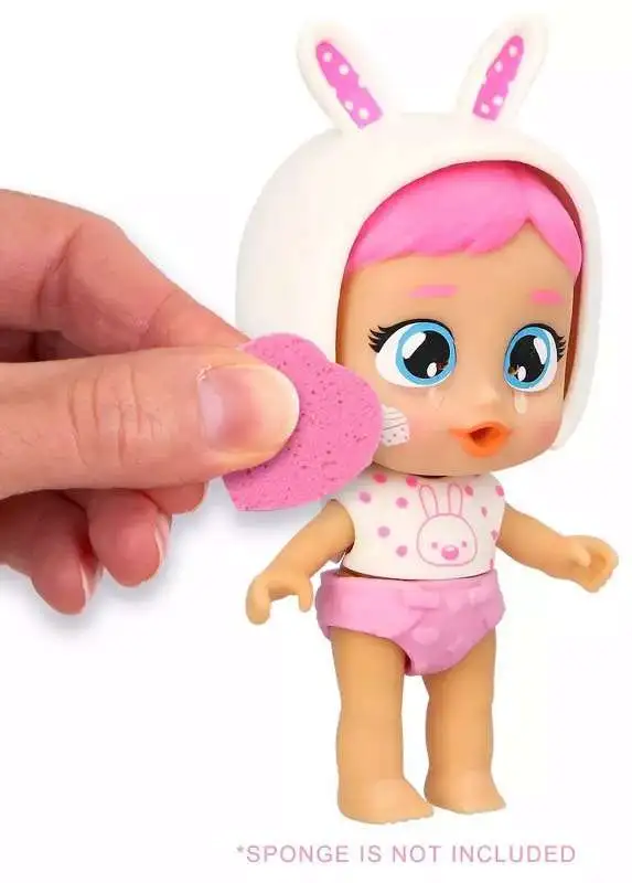 - Water tears reveal: Feed her with the baby bottle, squeeze her belly and she'll cry real tears. Using the tears, discover the cute design on her cheek.
