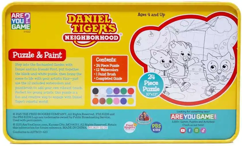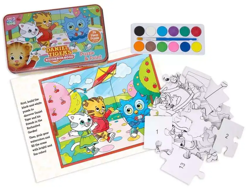 - Features a 24-piece black-and-white line art puzzle of Daniel Tiger's magical garden, easy for small hands with numbered pieces.