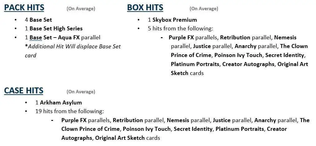 Premium Inserts: Look for unique inserts like Arkham Asylum die-cuts, The Clown Prince of Crime 3D lenticulars, Poison Ivy Touch etched foils, Enigmas glow-in-the-dark, and legacy sets including Jambalaya and Z-Force Rave.