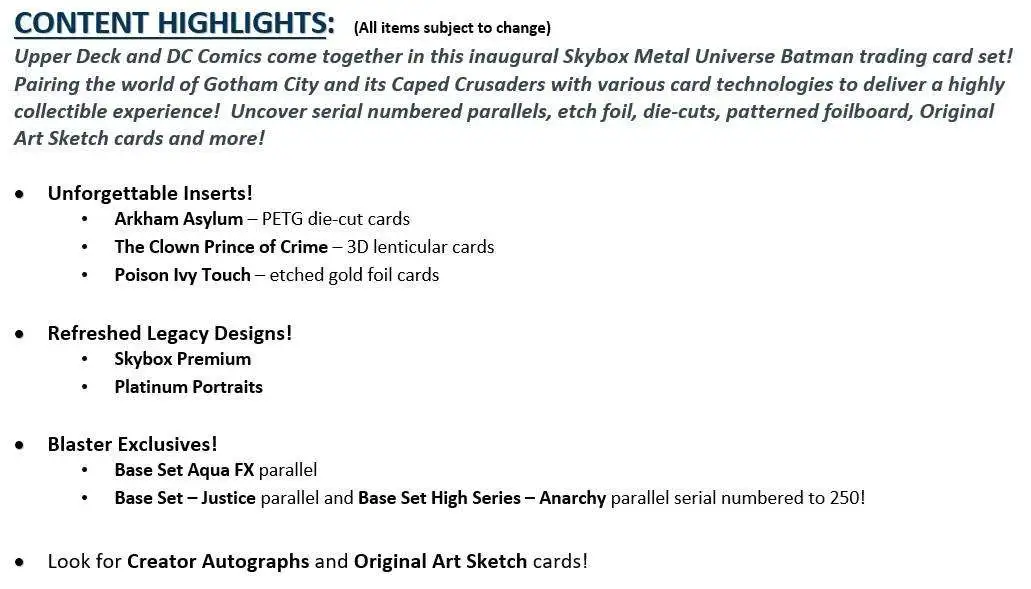 Theme & Design: Fuses Gothams iconic heroes and villains with the metallic artistry of Skybox Metal Universe offering a bold visual experience for Batman and trading card fans.