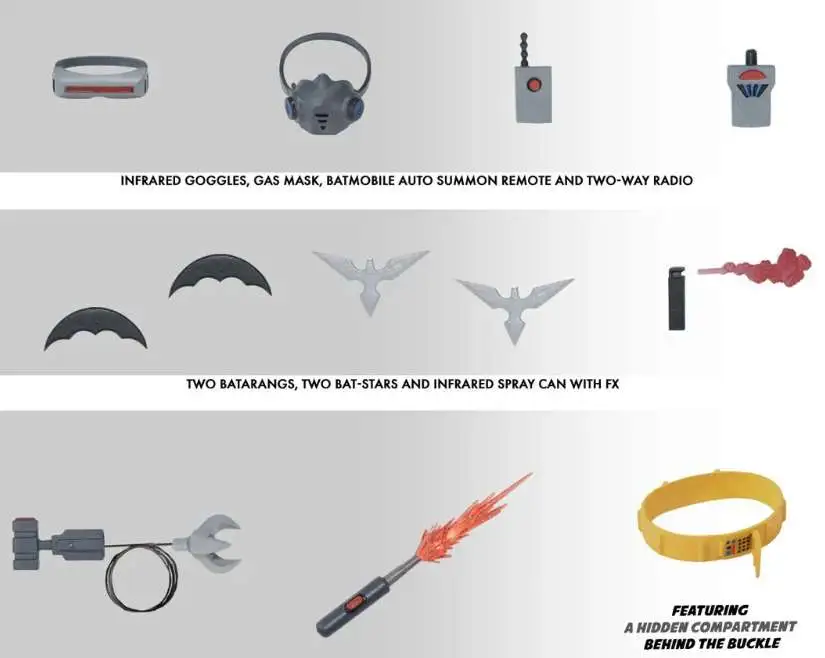When the night demands more than just skill and strength, Batman comes equipped with infrared goggles for enhanced vision, a re-breather mask for underwater pursuits, a remote to summon the Batmobile, and many more crime-fighting tools.