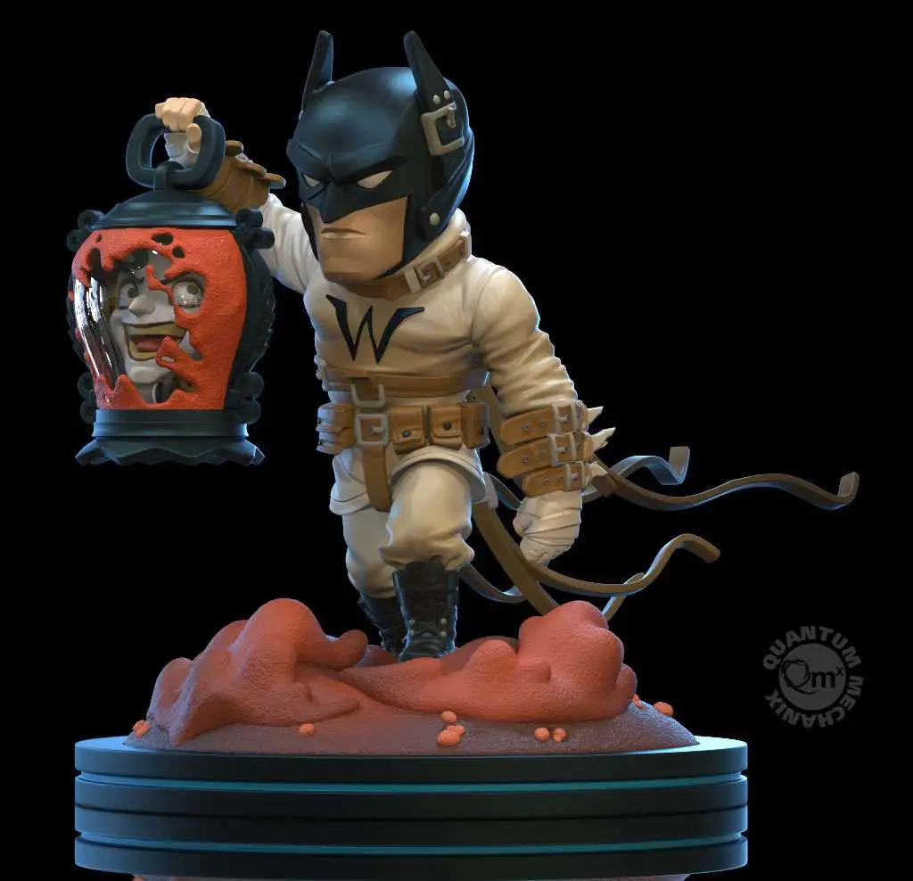 Based on the celebrated comic series Batman: Last Knight on Earth by Scott Snyder and Greg Capullo, The Last Knight Q-Fig Elite presents Bruce Wayne twenty years in the future, rumbling through an apocalyptic wasteland that was once Gotham City. Clad in a modified Arkham straight jacket and a handmade bat cowl, Batman wanders a devastated landscape carrying only a glass lantern containing the head of a seemingly alive and very talkative Joker.