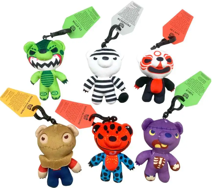 - An assortment of spooky, zombie bear backpack clip inside a blind bag