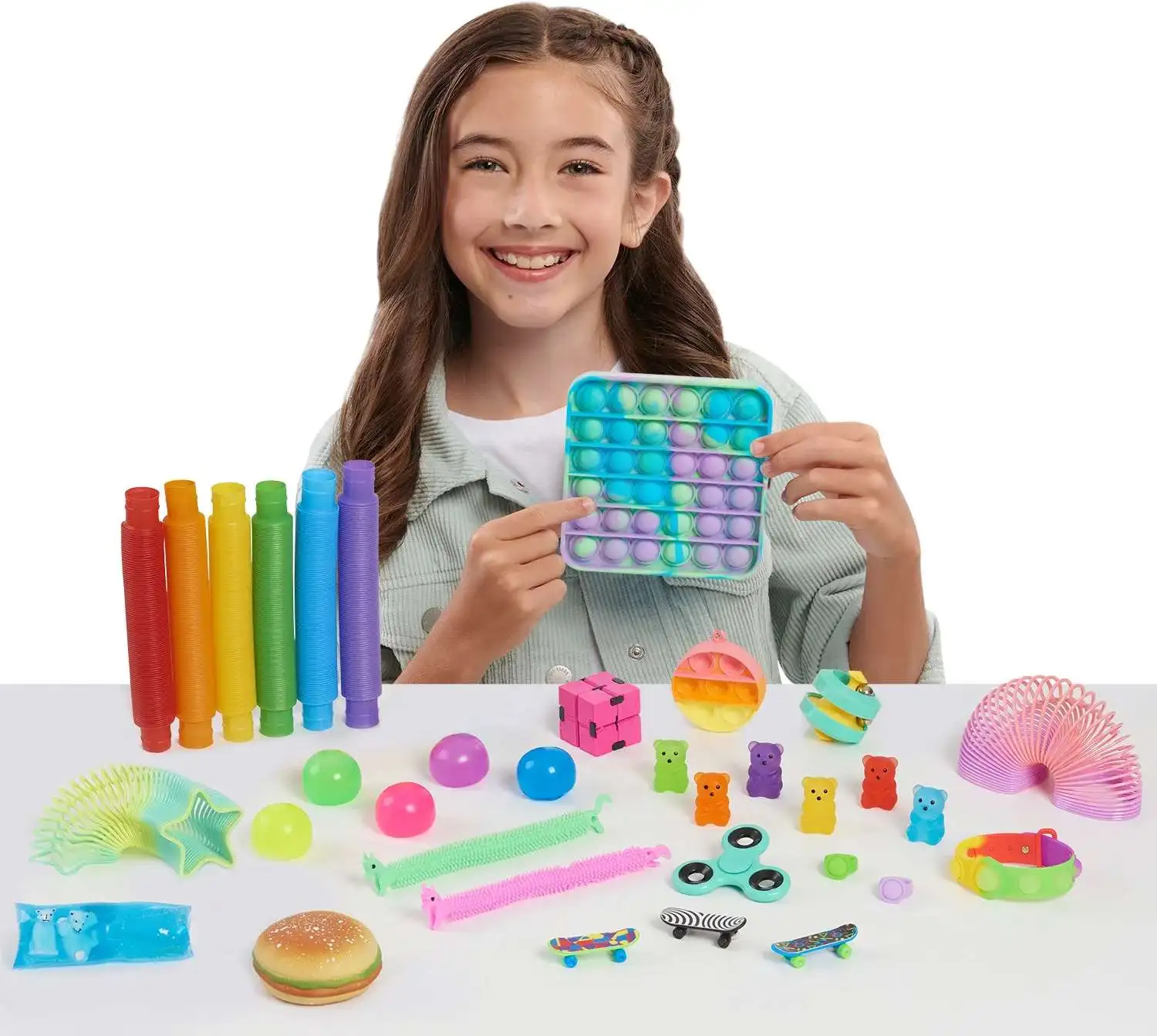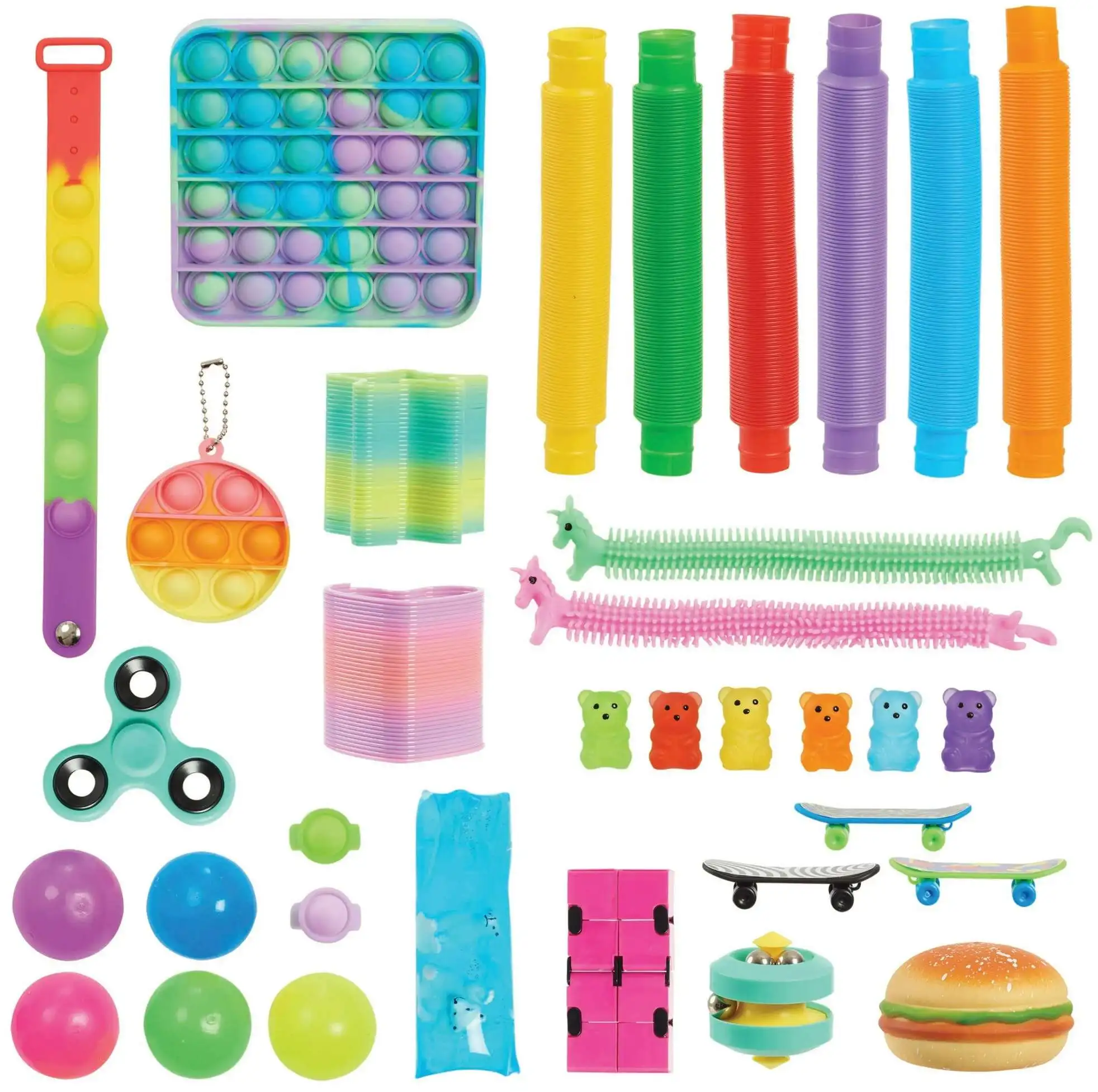 - Included: 1 reusable container and lid, 6 pop toobs, 1 large and 1 small tie-dye bubble pop, 1 super-soft smooshy mochi burger, 2 mini slinky toys, 5 squishy balls, 1 fidget spinner, 3 finger skateboards, 2 pop rings, 2 stretchy unicorns, 6 squishy bears, 1 puzzle ball, 1 infinity puzzle, and 1 filled water snake.