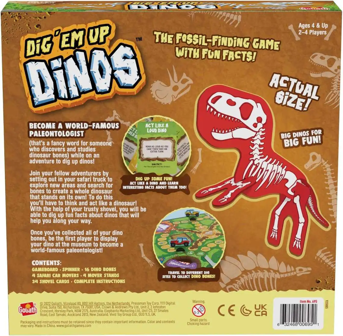 - Includes 1 Gameboard, 1 Spinner Card and Arrow, 16 Dino Bones, 4 Safari Truck Movers, 4 Mover Stands, 34 Dig Cards, and Complete Instructions