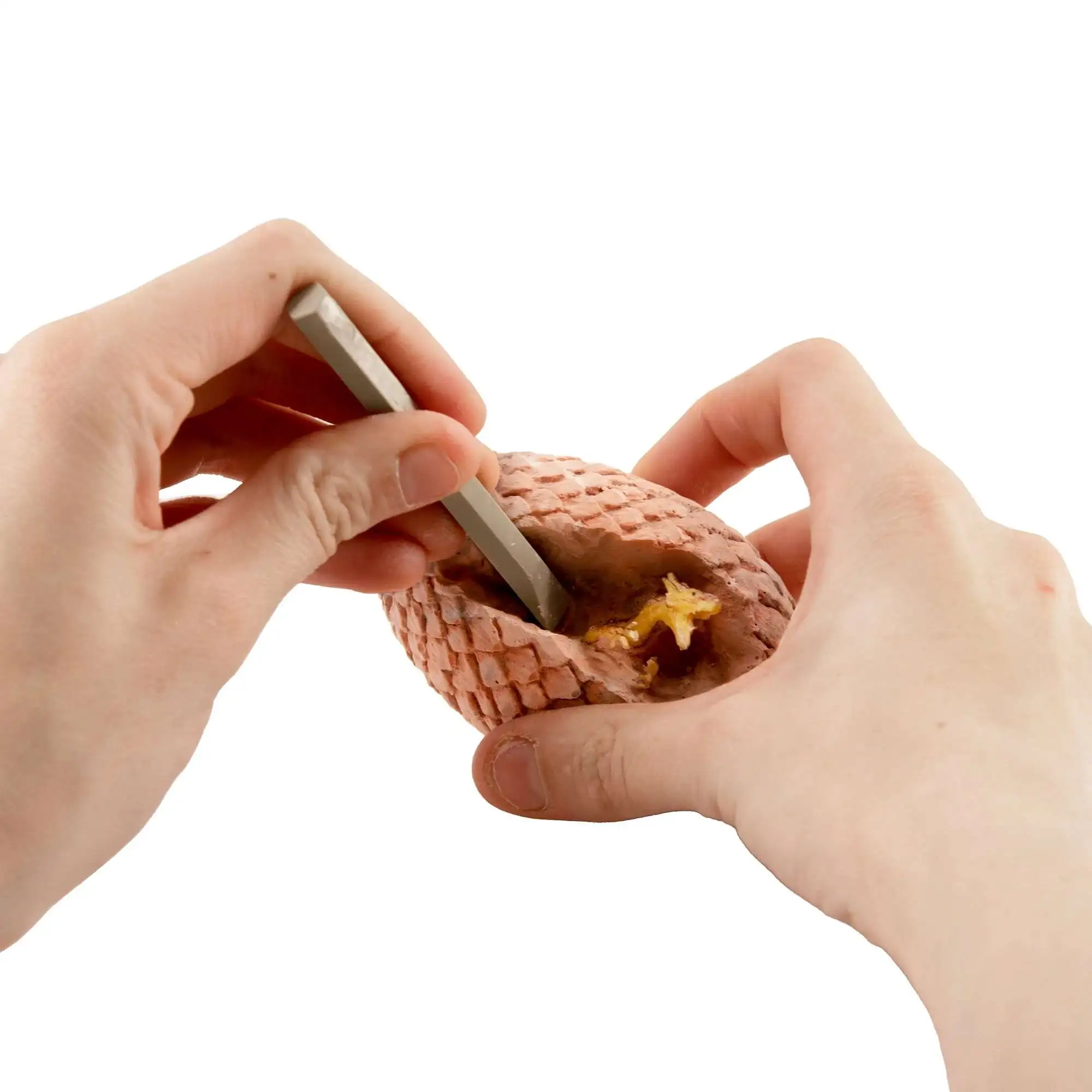 - Scaly egg-shaped plaster with dragon figurine inside, chisel tool