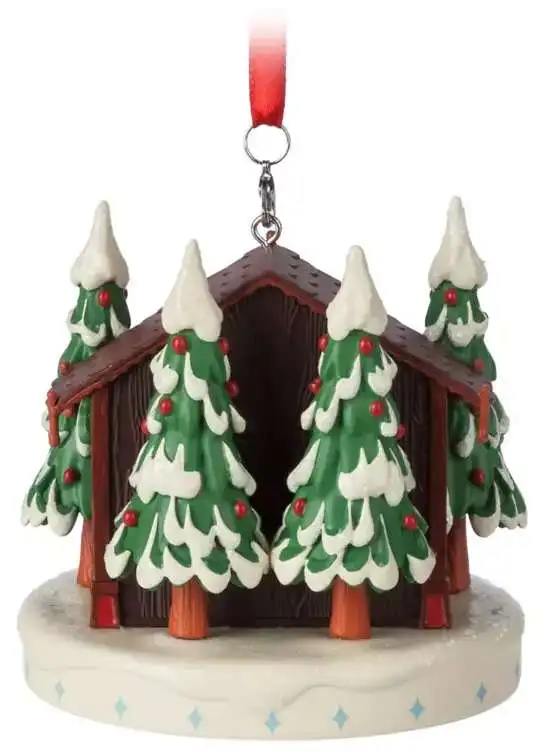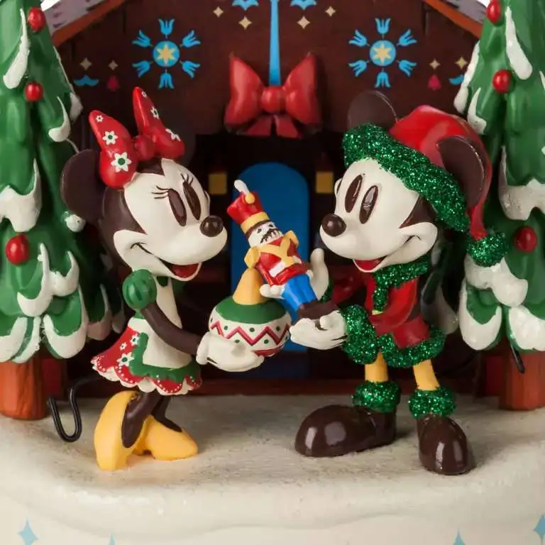 - Fully sculpted figural ornament, Features Mickey and Minnie, Snow-covered base