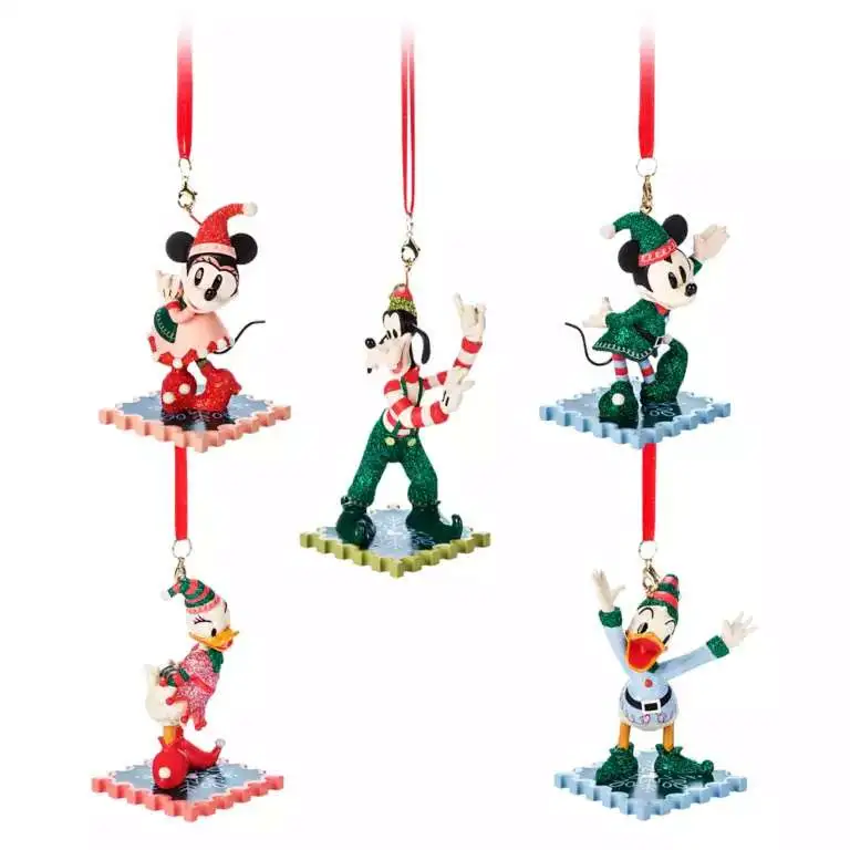 - Includes Mickey Mouse, Minnie Mouse, Donald Duck, Daisy Duck, and Goofy in elf suits, Glitter accents