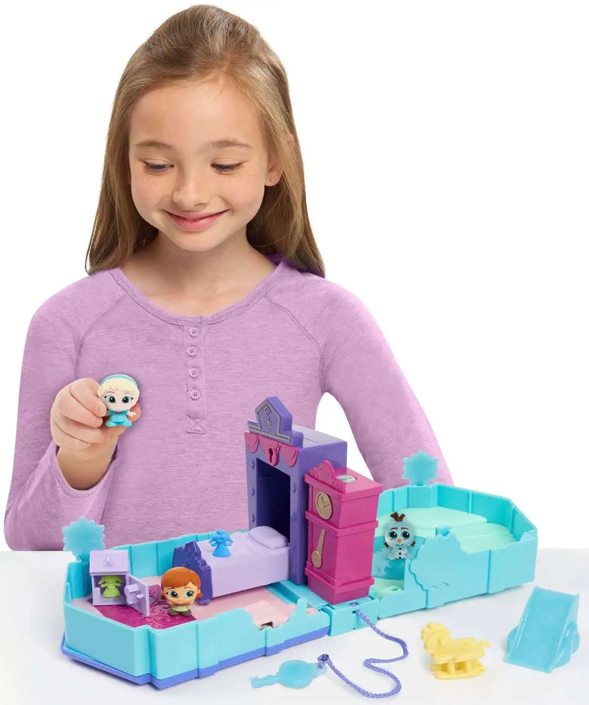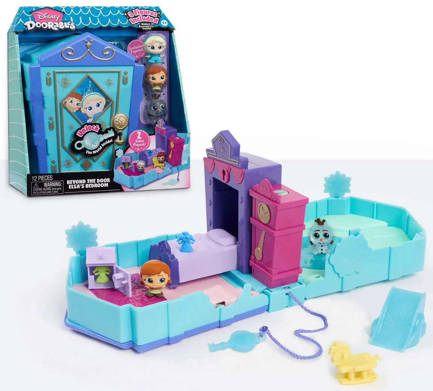 This 6-inch tall on-the-go table-top playset is inspired by Disneys Frozen and unfolds to reveal two play areas. It even includes three exclusive Disney Doorables figures Young Elsa, Young Anna, and Olaf!