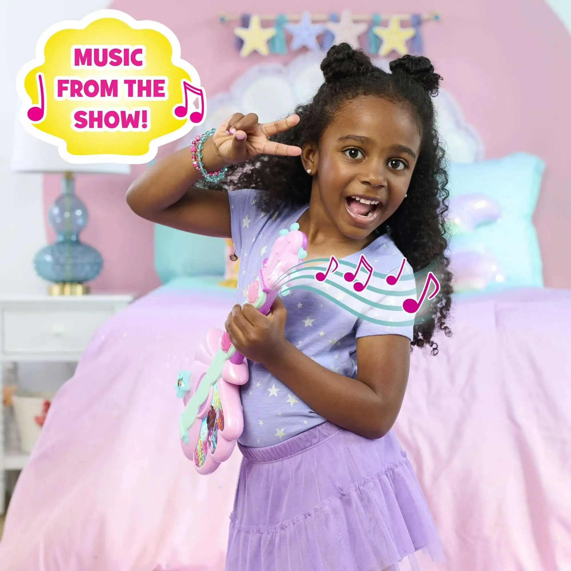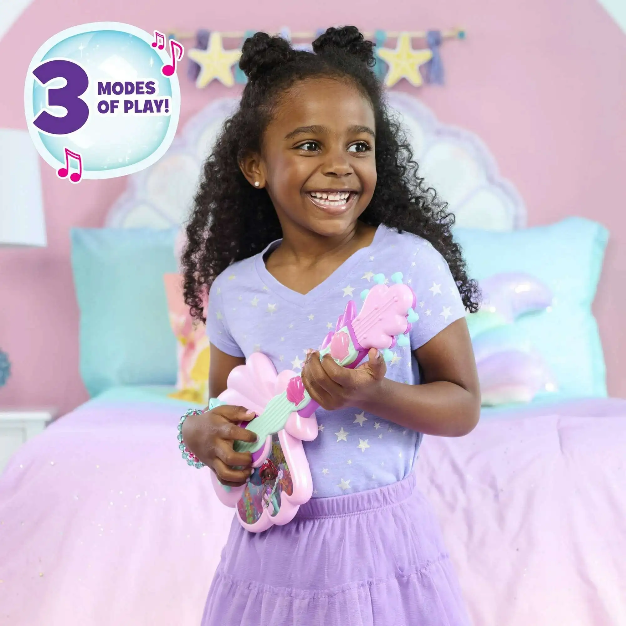 - An Origin Story: Inspired by Disney Junior's hit show, Ariel, this 15.5-inch-long toy guitar has a shimmery pink shell-shaped body, a purple and aqua neck, pink headstock, and 3 colorful shell LED buttons. The guitar plays the show's theme and an additional song.