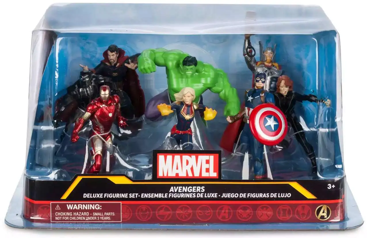 - Set of eight fully sculpted figures:Captain Marvel, Thor, Iron Man, Captain America, Black Widow, Doctor Strange, Black Panther, Hulk.