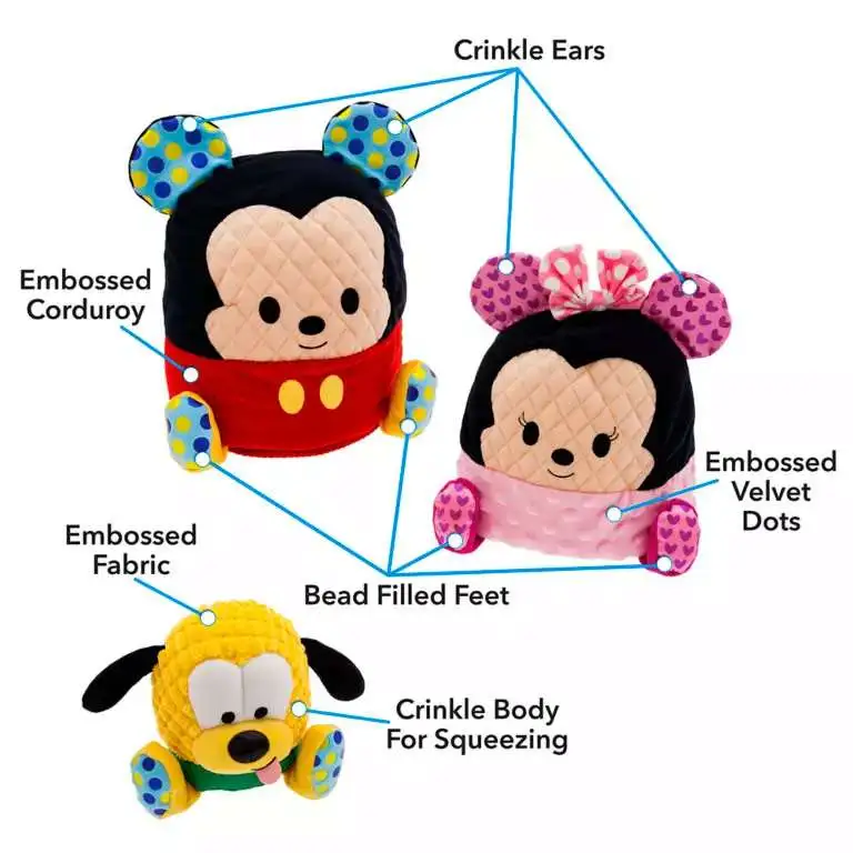- Set includes three nesting sensory plush: Mickey Mouse, Minnie Mouse and Pluto