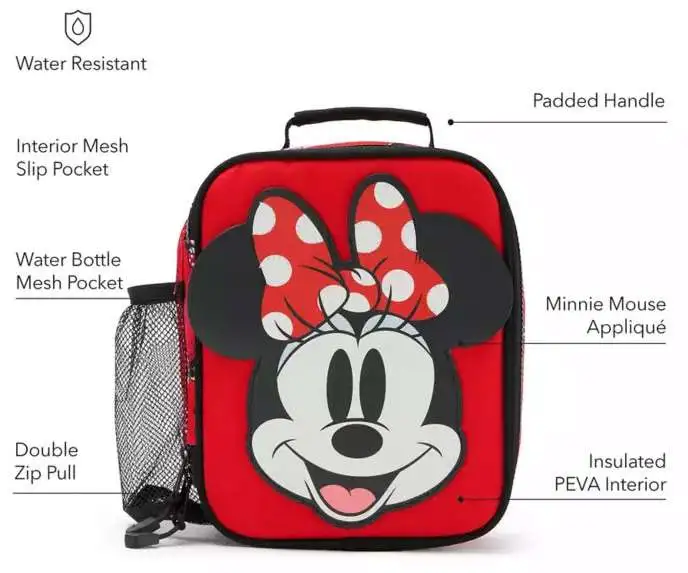 - Sides and back feature allover print with Minnie, bows, and ''Minnie Mouse'' penannts