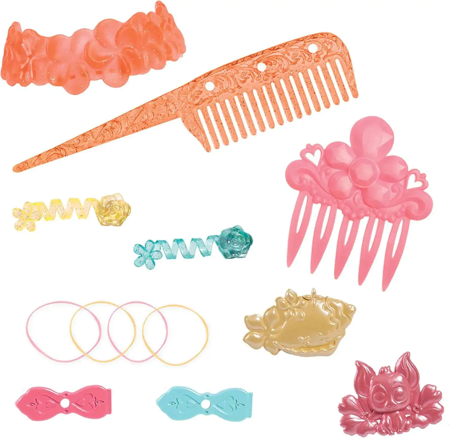 - Includes: Moana styling head, flower crown, comb, 2 barrettes, 2 hair spirals, 2 charms, decorative hair comb, 4 hair elastics.