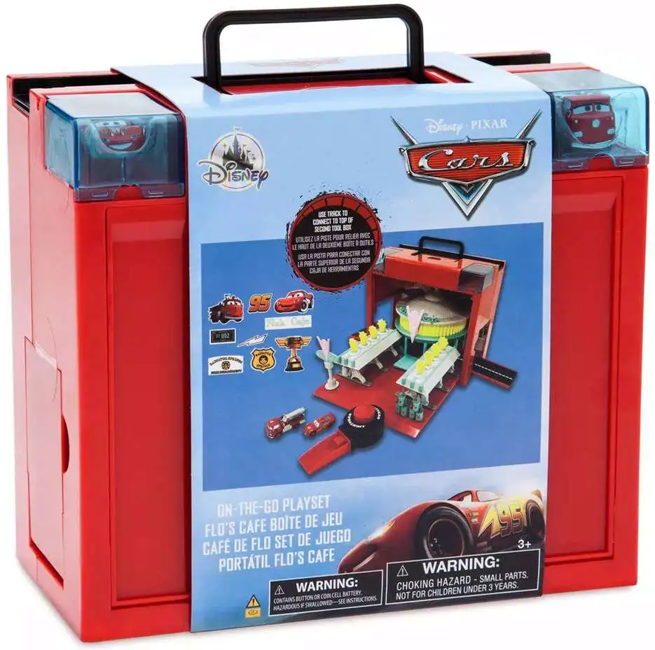 - Set includes: 1 toolbox case (front panel opens for play), 2 miniature die cast cars (Lightning McQueen and Red), 1 launcher, 1 Flo's V8 cafe diner, 1 sign, 2 gas pump stations, 2 oil can stacks, 1 track (2 segments fold out from sides of case), 1 sticker sheet, 1 instruction sheet.