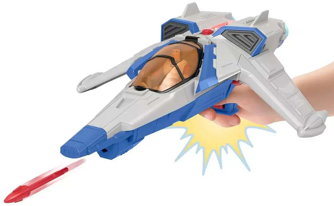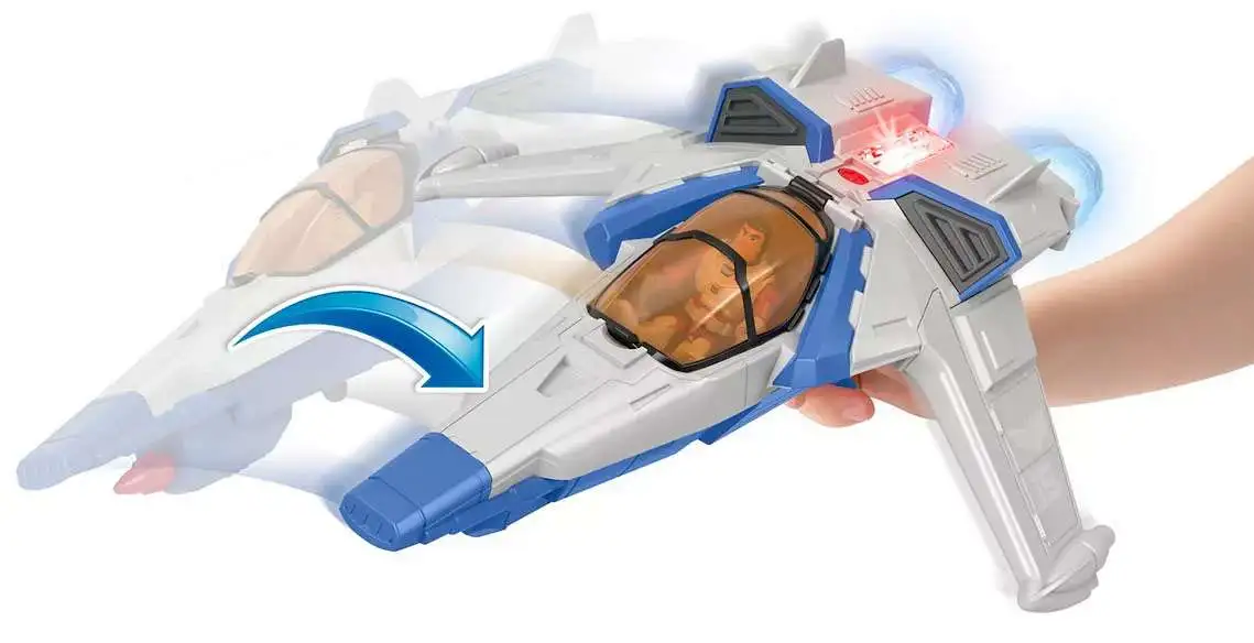 - Press the top button on the spaceship to pop out the light up engines for hyperspeed flight mode, then press the trigger to activate lights, sounds, and launch projectiles
