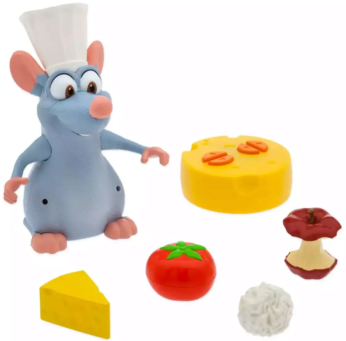 - Featuring Remy, remote control cheese wheel and toy tomato, apple core, cheese wedge and white ball