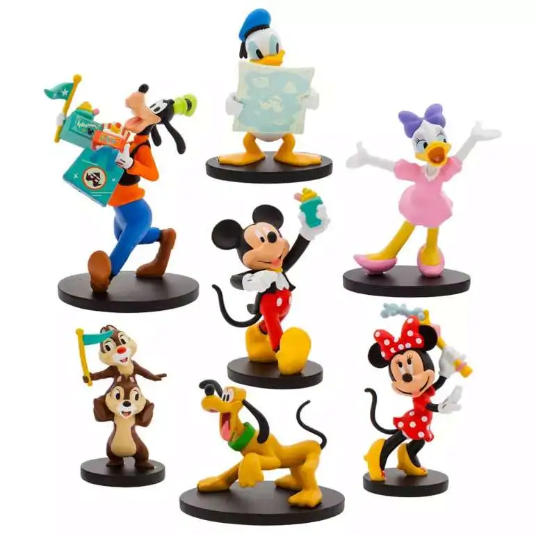 - Set of seven fully sculpted figures includes:Mickey Mouse with pineapple swirl, Minnie Mouse with bubble wand, Donald Duck with park map, Daisy Duck, Goofy with popcorn, autograph book, pineapple swirl, pennant, and shopping bag, Pluto, Chip 'n Dale with pennant.