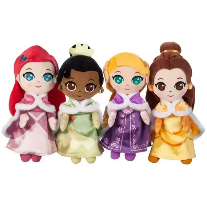 - Set of four soft dolls, Includes Ariel, Belle, Tiana, and Rapunzel