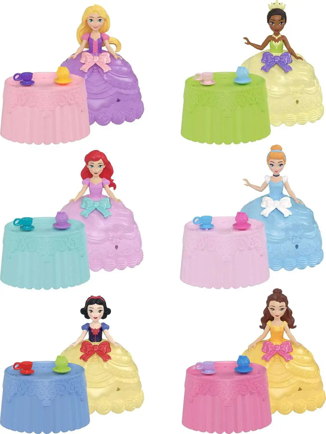 - Open the cupcake to find a Disney Princess small doll (3.5 inches) inside! Dolls might be Cinderella, Tiana, Ariel, Rapunzel, Snow White or Belle.